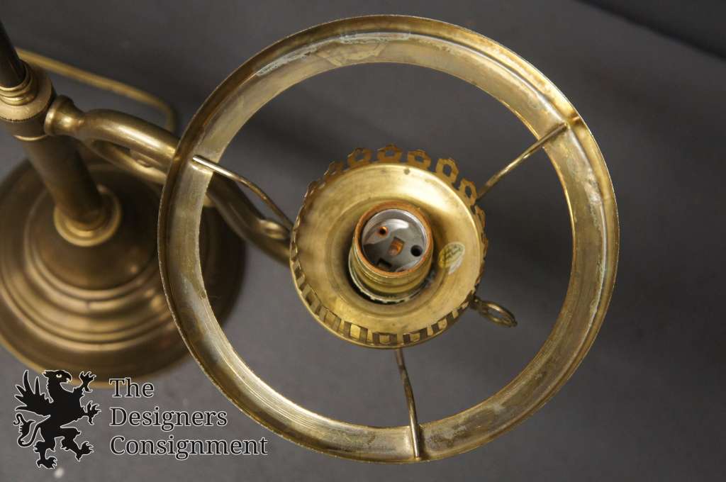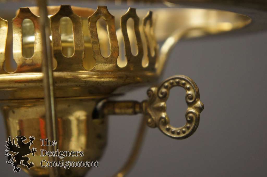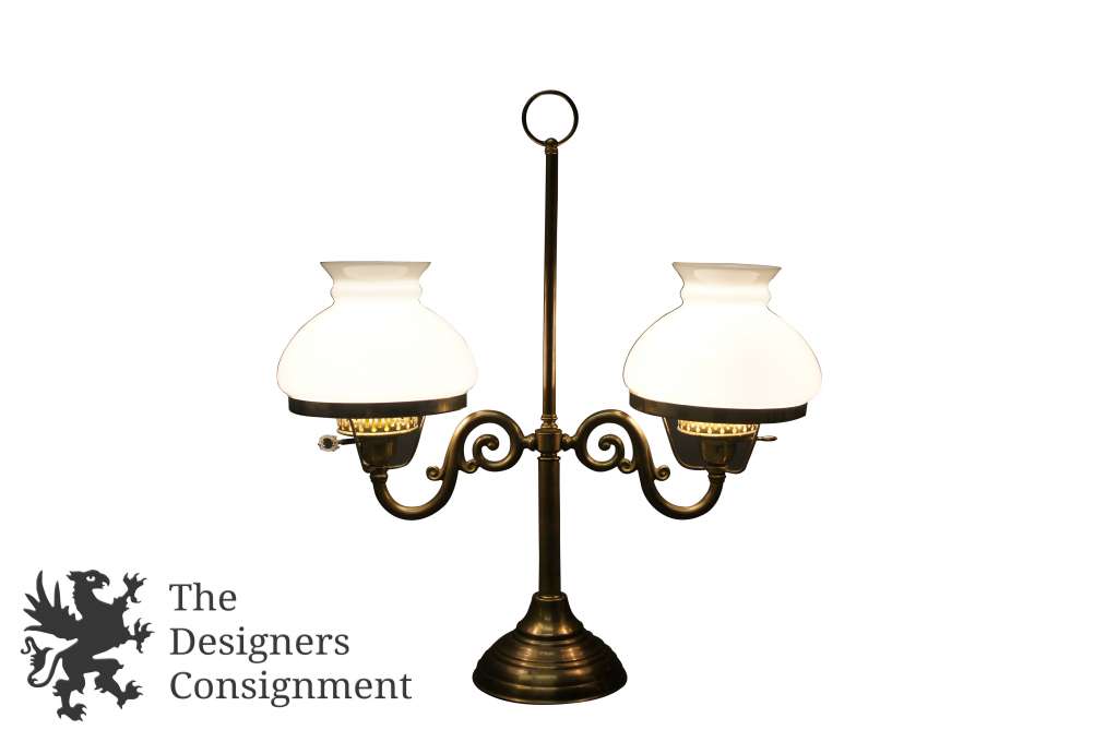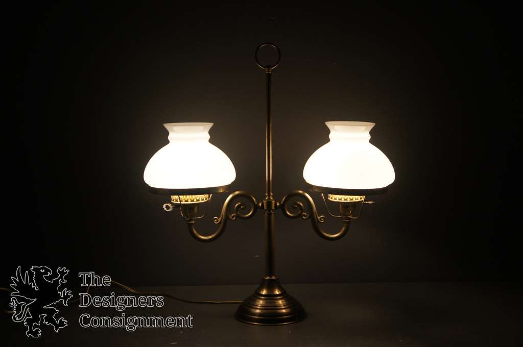 Victorian Hurricane lantern style lamp. Brass with milk glass shades. Handled along the top for ease of movement.