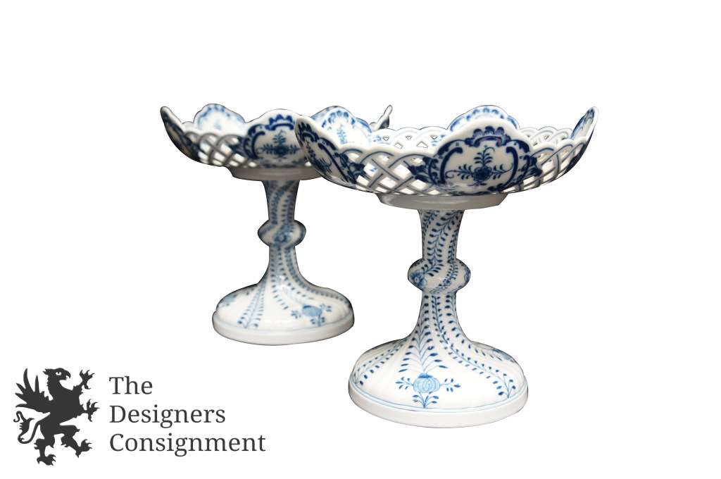 Beautiful pair of Blue Onion pattern compotes by Meissen. Early 20th century blue and white porcelain withpiercedbasket weave design. An elegant addition to any setting.