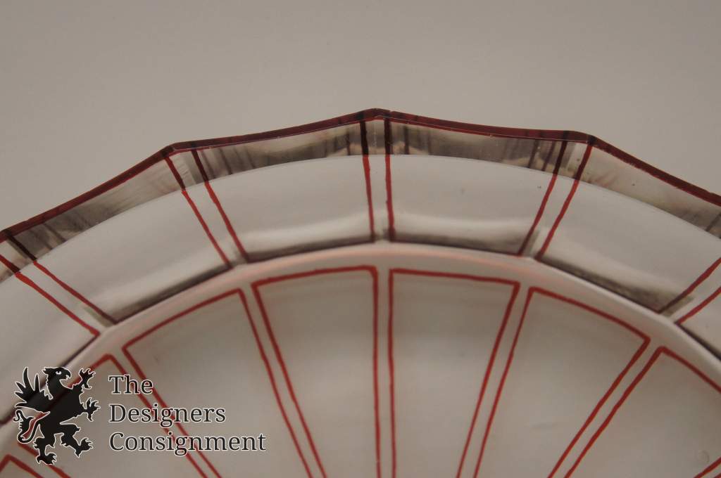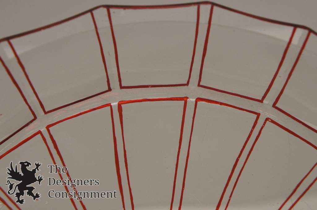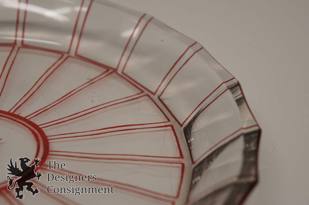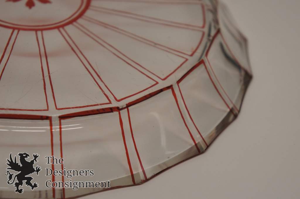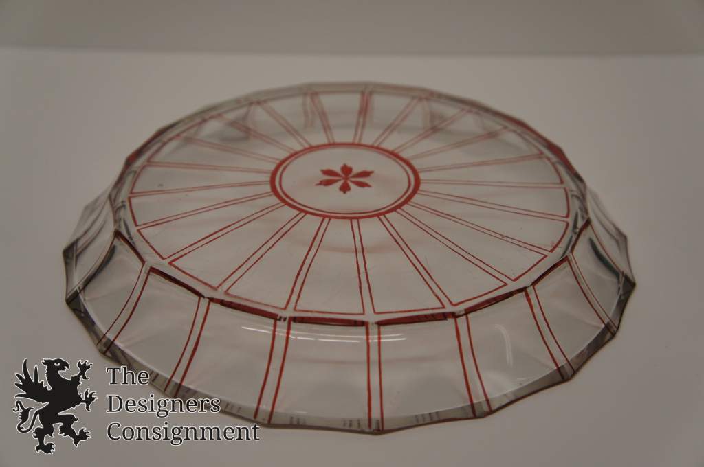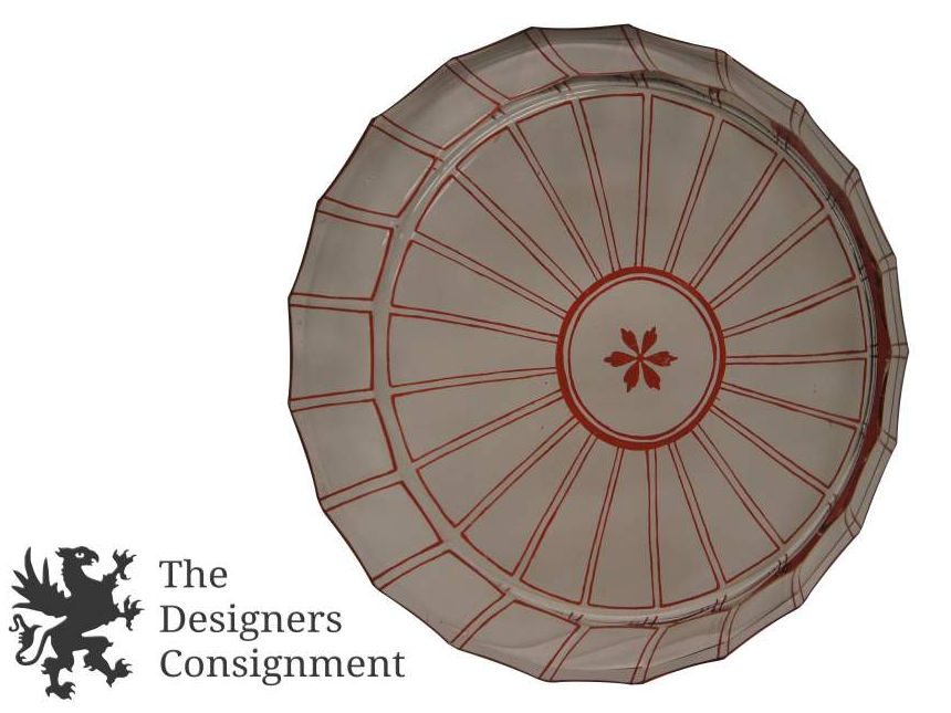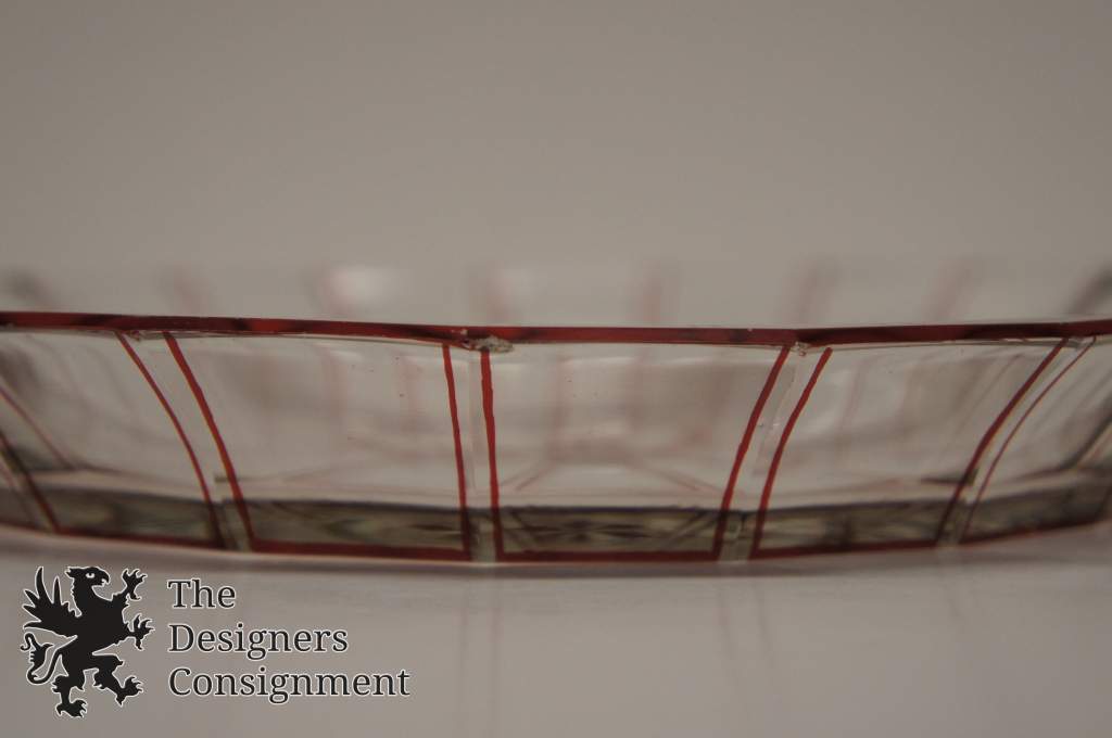 Hand blown bohemian glass bar/ cocktail tray. hand laid ruby colored stingers over clear with a leaf design in the center. A great addition to any collection.