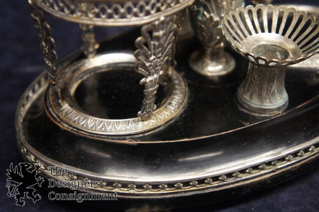 Vintage crystal cruet set with oil and vinegar bottles with stoppers and two salt cellars, intricate silver plated caddy with black base and claw foot legs.