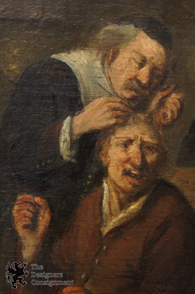 A magnificent piece featuring a medical examination/ Surgery. Circa 17thCenturyOil on Board. Gentleman can be seen sitting at the center, while Doctor stitches up his head. Family is seen in the background as well as individuals peering through the windows. Beautiful color and subject matter. See the last photo for an example of past auction recrods.