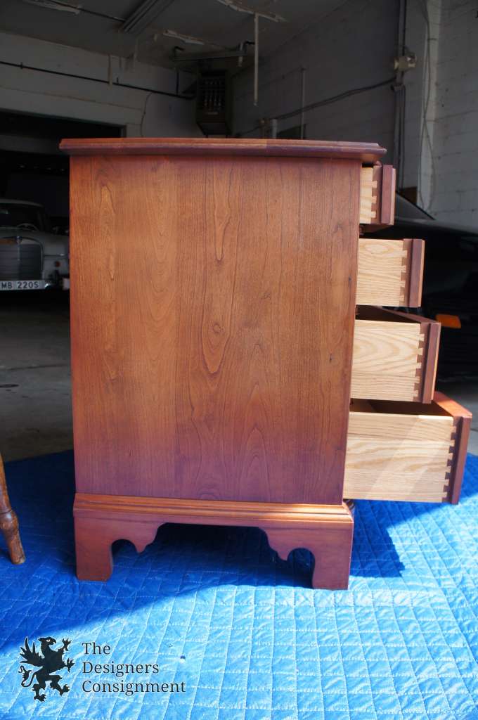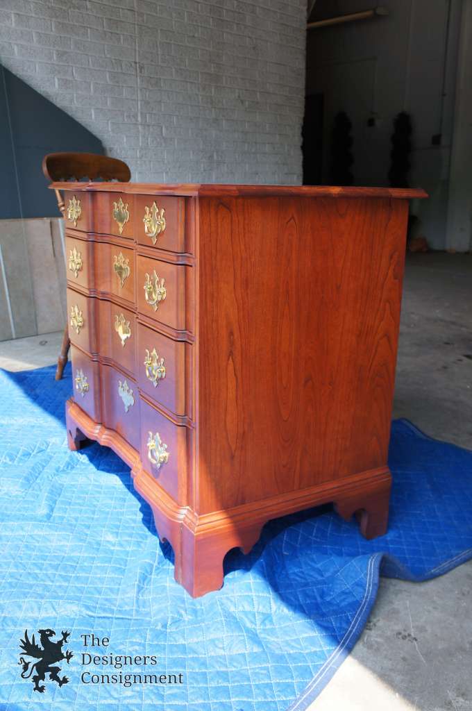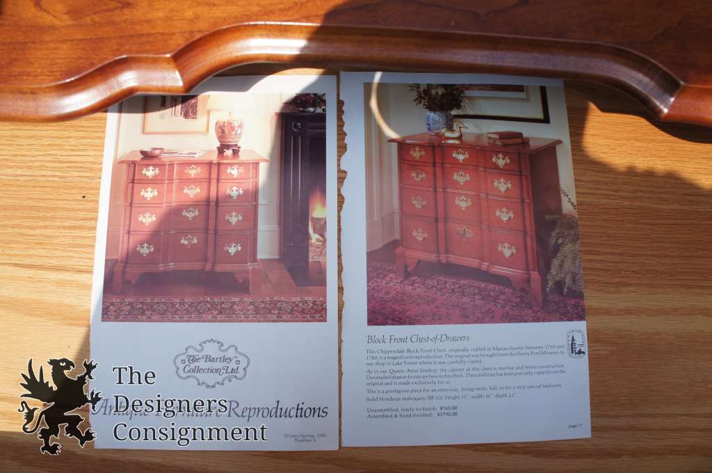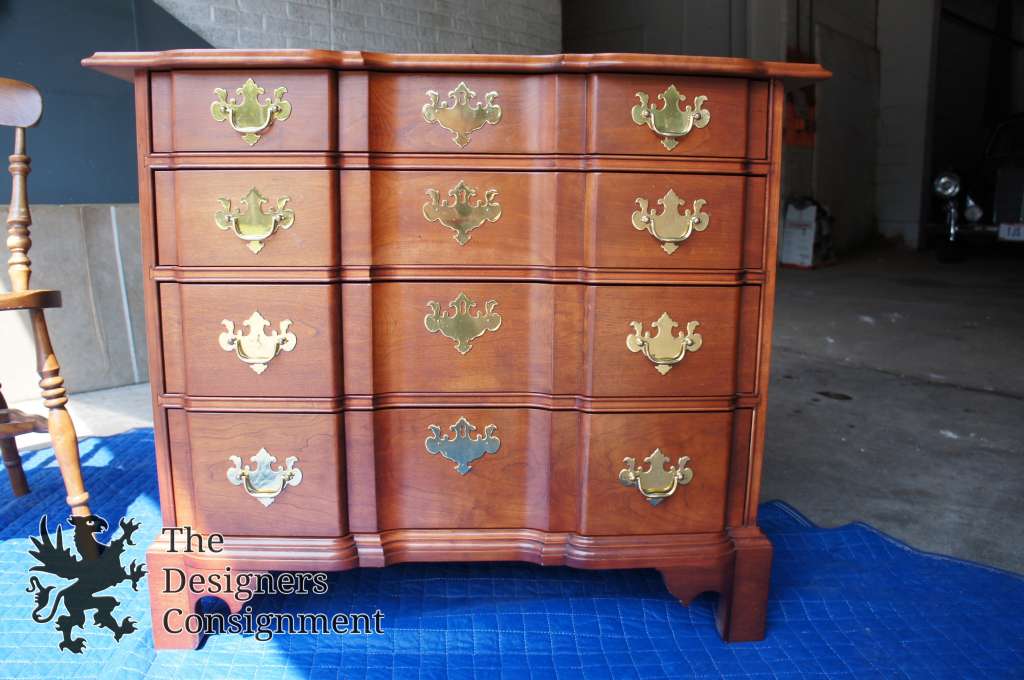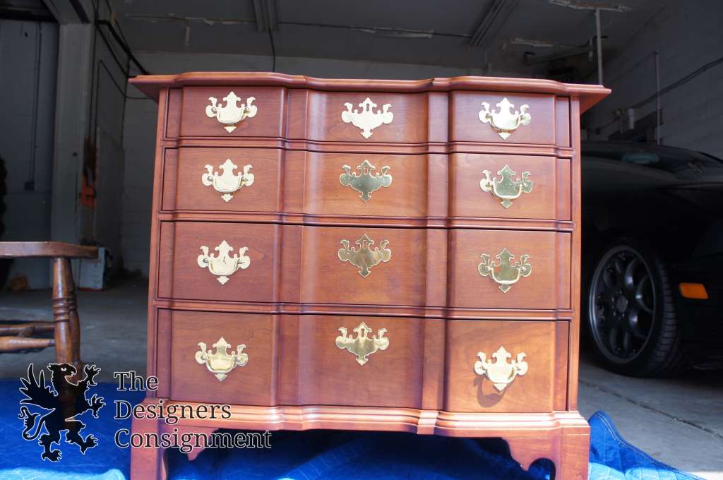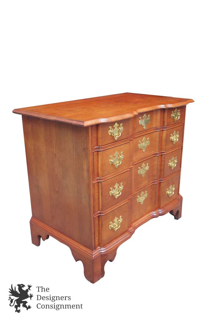 A stunning Chippendale George III style block front Goddard chest. Made from solid cherry with a serpentine front featuring a recessed center. Drawers are dovetailed and glide smoothly. Accented with brasshardware. A great addition to any collection.