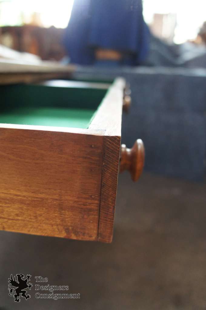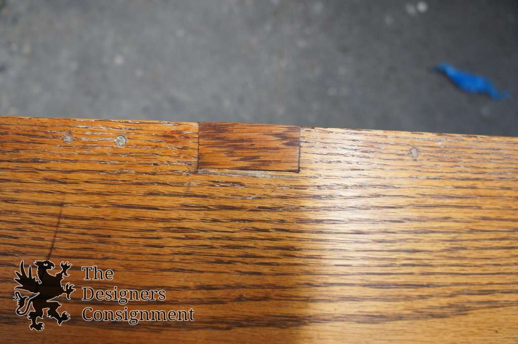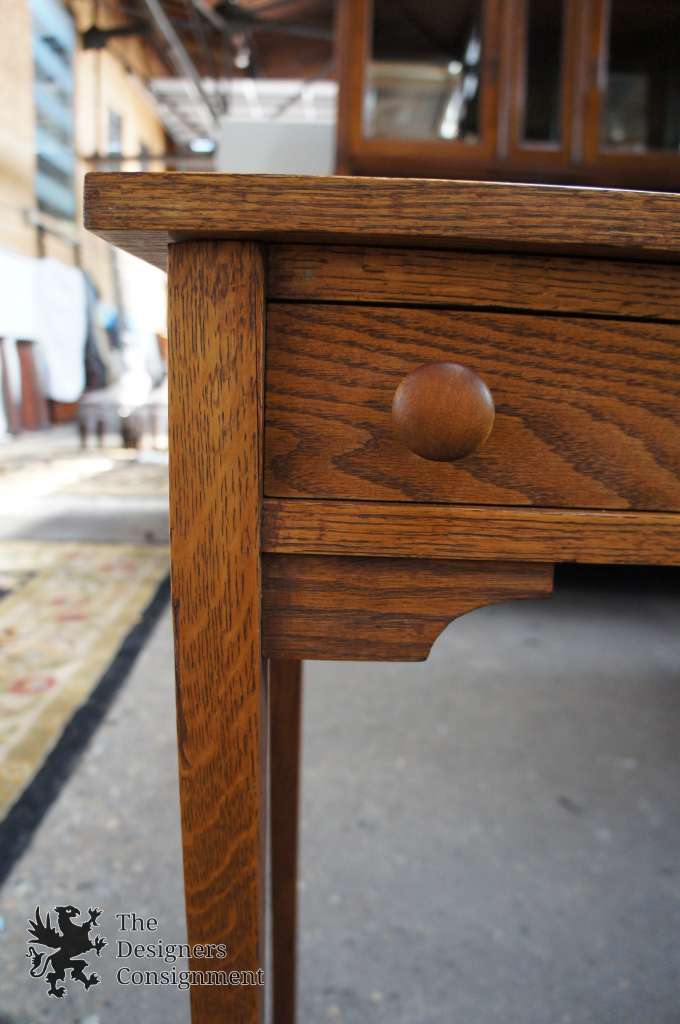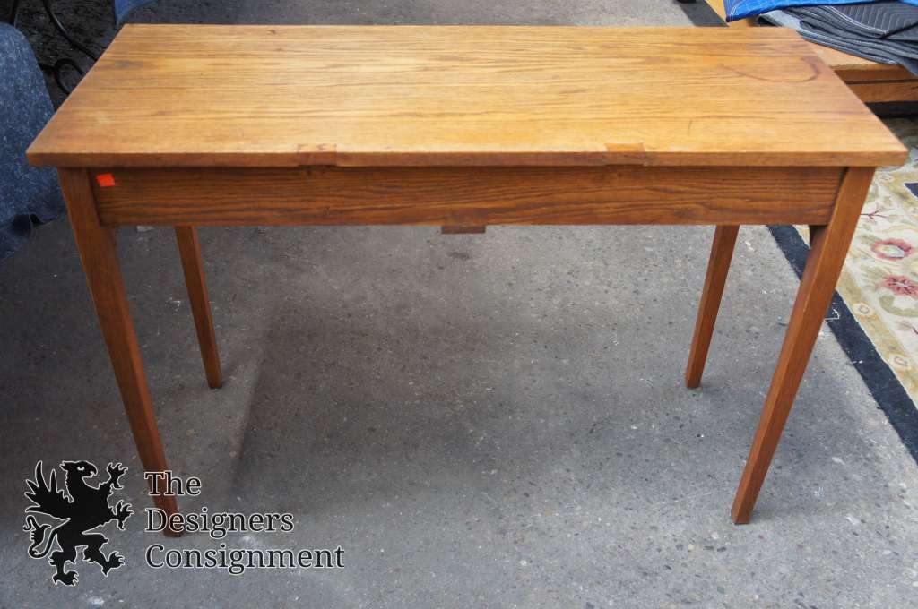 Mission Arts & Crafts style Oak writing desk. Features 2 felt lined drawers. Top wasre-purposedfrom what appears to be an old cabinet door. Hinge marks can be seen towards the rear.