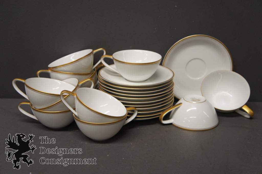 90 Piece dinner setting in "Bradford pattern" Pure whitebase with gold rim.