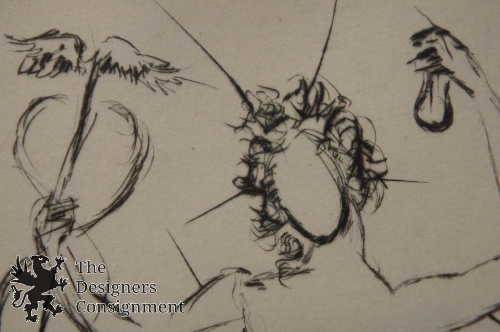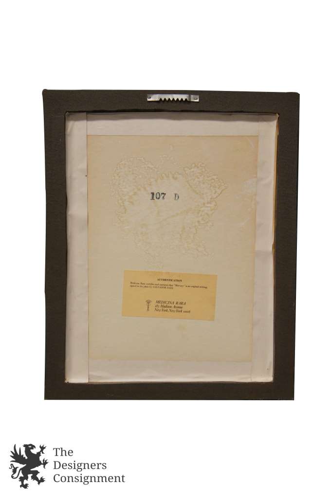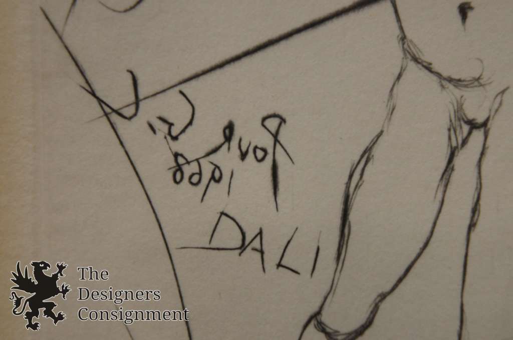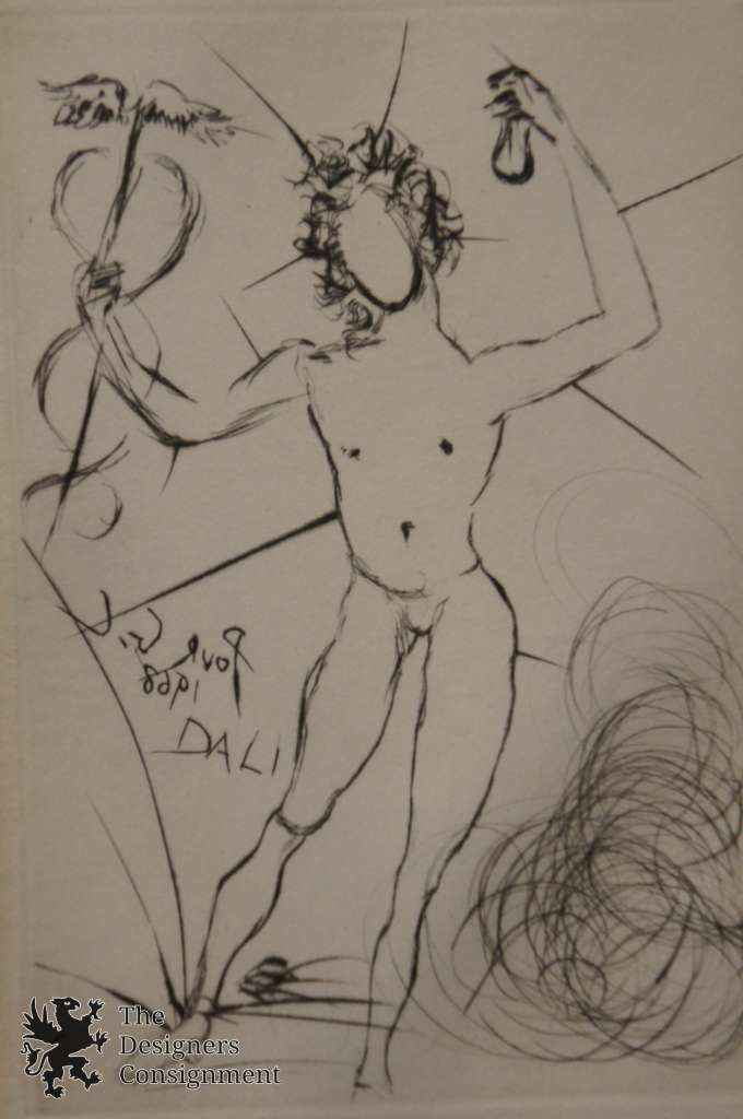 ETCHING BY SALVADOR DALI "MERCURY" 1968. AUTHENTIC ETCHING BY SURREALIST ARTIST, SALVADOR DALI (SPANISH 1904-1989). BACK LABEL STATES: AUTHENTICATION. MEDICINA RARA CERTIFIES AND WARRANTS THAT "MERCURY" IS AN ORIGINAL ETCHING, SIGNED IN THE PLATE BY SALVADOR