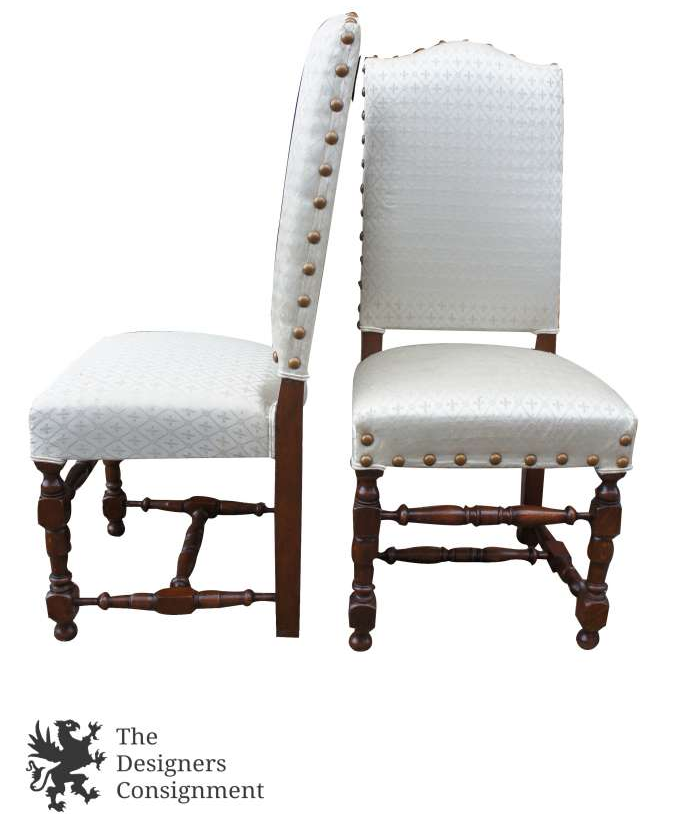 Abeautifulset of old world Spanish/ Jacobean style dining chairs. Made from oak and finished with a Fleur-de-lis upholstery and brass nail head trim. Perfect for any setting.