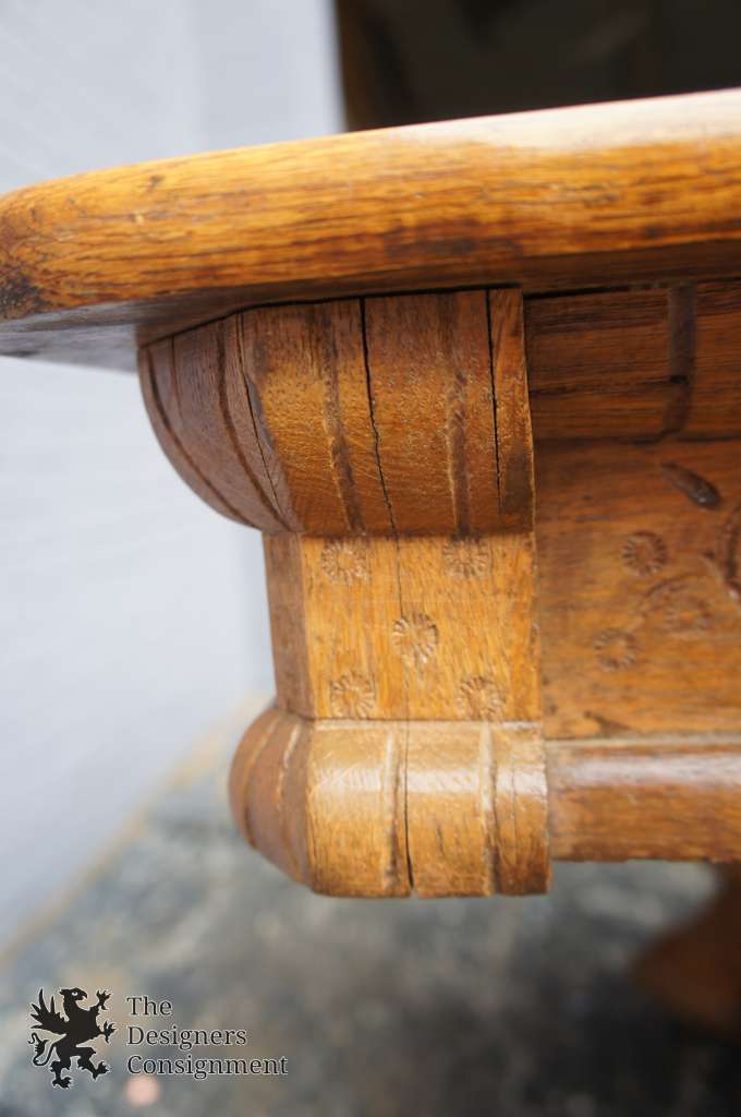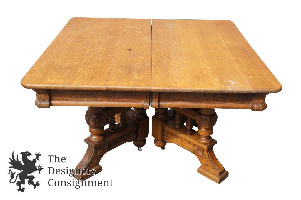 A stunning Victorian Eastlake dining table. Made from Quartersawn Oak with meticulously carved detail. Features a floral pattern boarding the apron, hand turned legs and sunburst medallions. Each side of the base has 3 casters. Table does not have any leafs, but we could have some made for an addition cost.