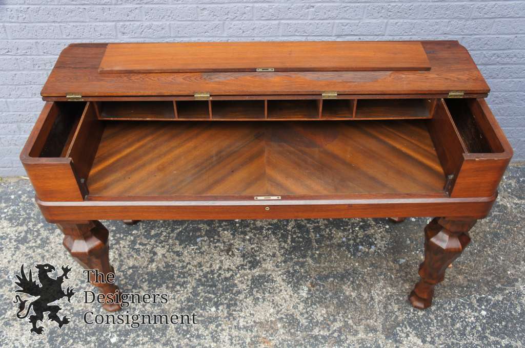 Beautiful Antique Spinet/Piano Desk. Made from Walnut with flip top. Top hinges completely open revealing the back side of storage pockets, and top of pigeon holes. Legs are nice and robust with amazing wood grain. Could also be used as an entry table.