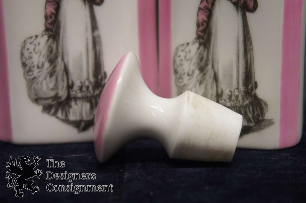 A beautiful pair of perfume or lotion bottles by Porcelain de Paris. Each is hand painted in pink with a Victorian lady long the front.