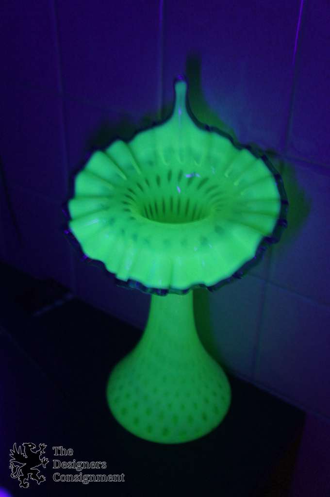 A rare Jack in the Pulpit tulip vase by Fenton. A creme uranium glass with optic bubble pattern and blue ruffled edge. The second picture shows a photo of it next to a black light. The perfectadditionto your collection.