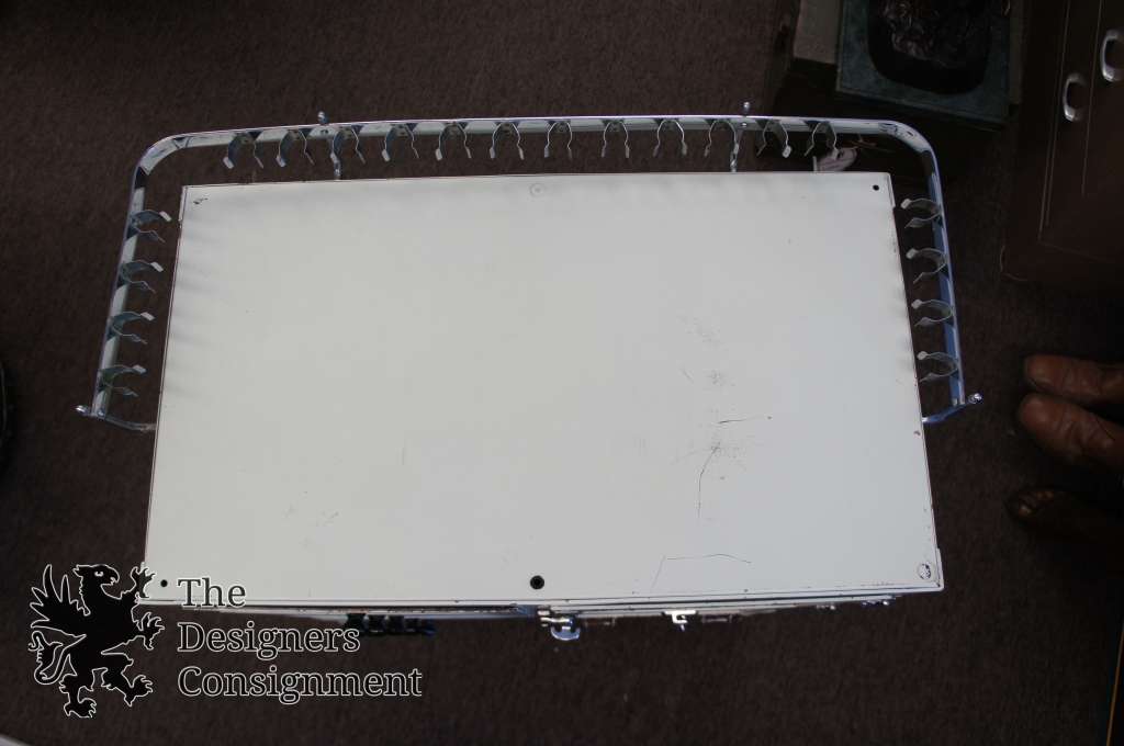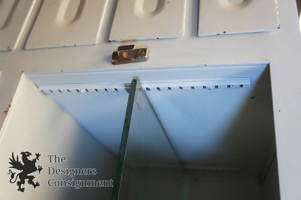 1940s industrial cabinet. Originally came from an Opticians office. Made from medal with a white finish and chrome accents. Along the right is a glass door with adjustable shelf and hatch below. The chrome bar along the top was meant to hold instruments.