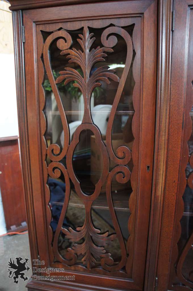 Exquisitelycrafted early 20th century china cabinet. Made in Germany from Mahogany. Featuresbeautifully carved floraldetail in high relief. Crown is openpediment and flanked with finials around the upper apron. Doors are lined with glass andfretwork. A great piece for display! Matching sideboard and table available ifinterested