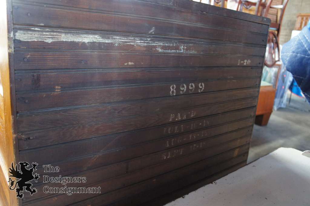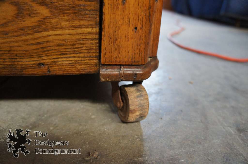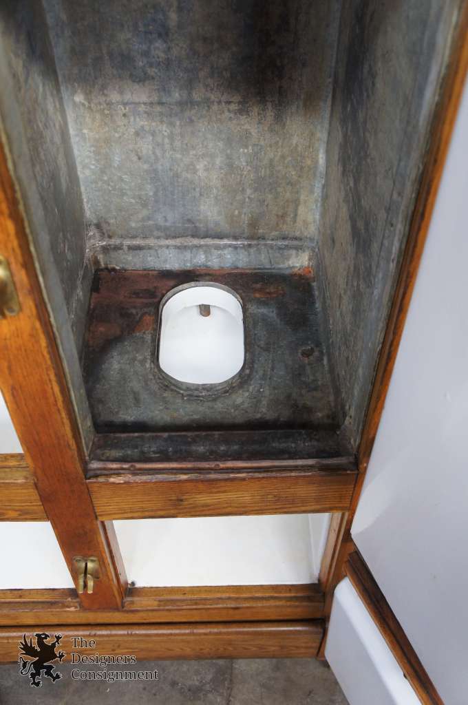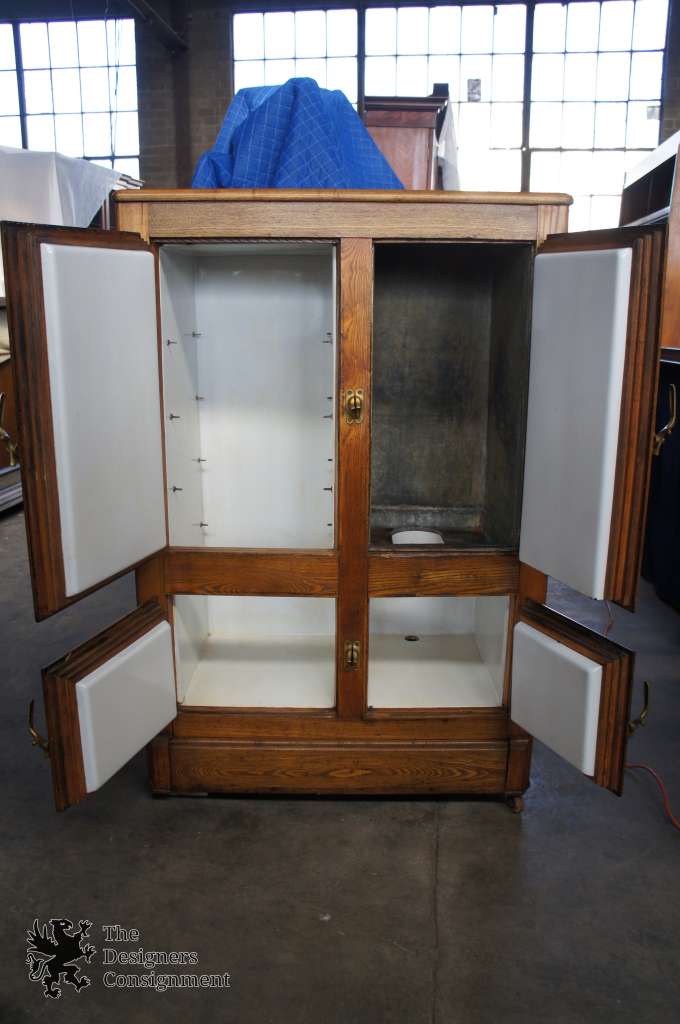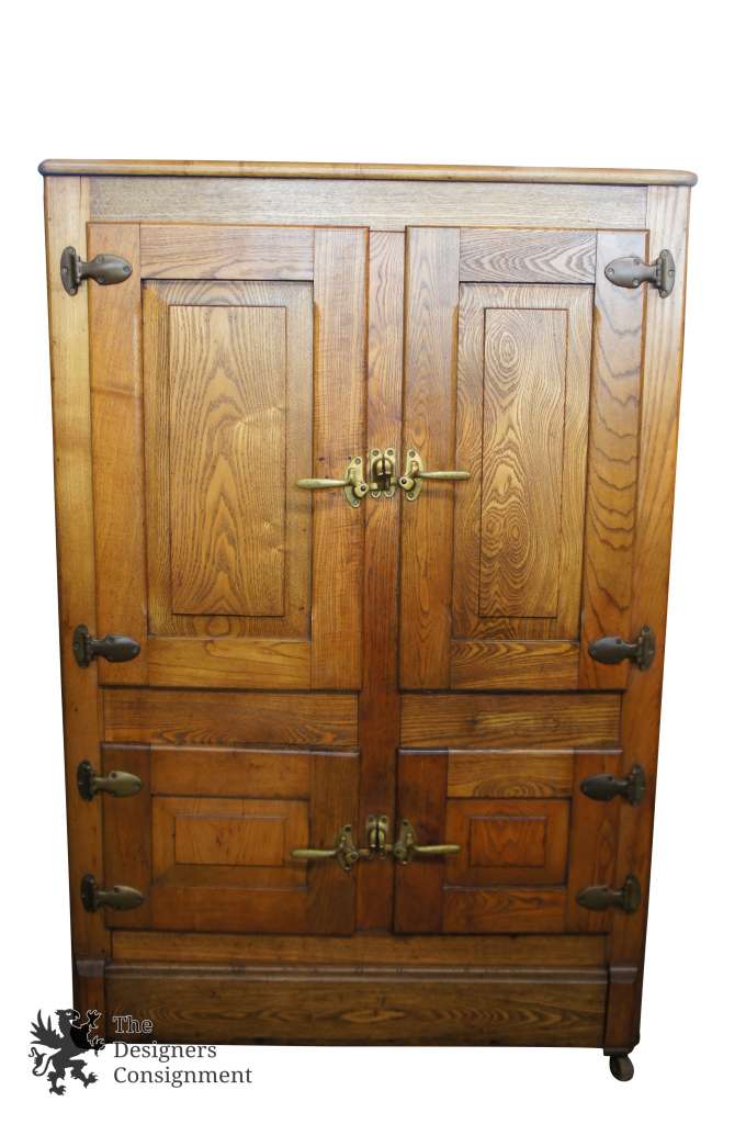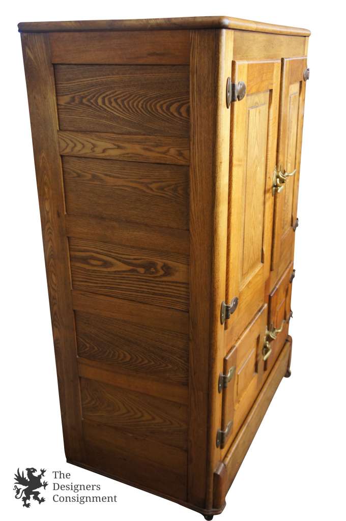 Solid Quartersawn Oak Ice Box. Patented in 1918. Features 4 with original brass hardware, and lower hinged door for drip pan. Porcelain lined. A great addition to any setting.