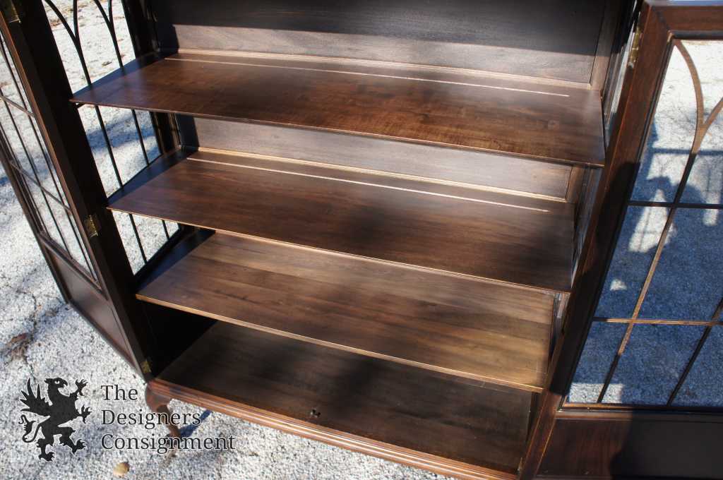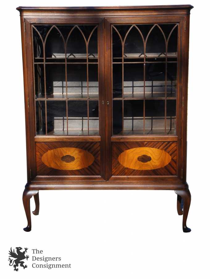 A gorgeous 1940s bookcase. Queen Anne style with swooping cabriole legs. Rear feet are uniquely cut allowing it to sit flush against a wall. Made from Mahogany with marquetry panels and fretwork lined glass. The cabinet is locking with 3 interior shelves. Additional matching pieces available.