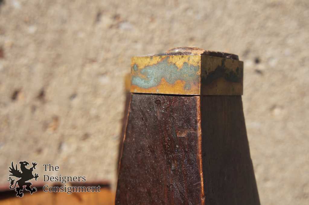 A cute mission style stool. Finished in red leather with nail head trim. Legs Taper to brass capped feet.