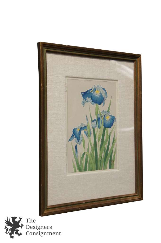 Chinese Floral Woodblock Print in Gilded Frame Blue & White Iris Flowers Asian