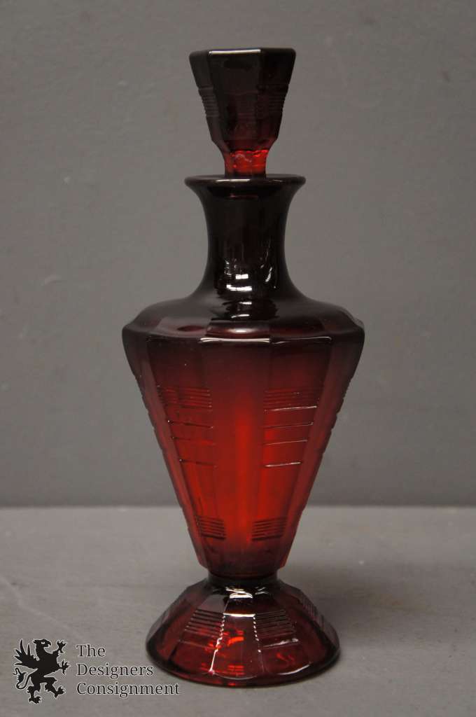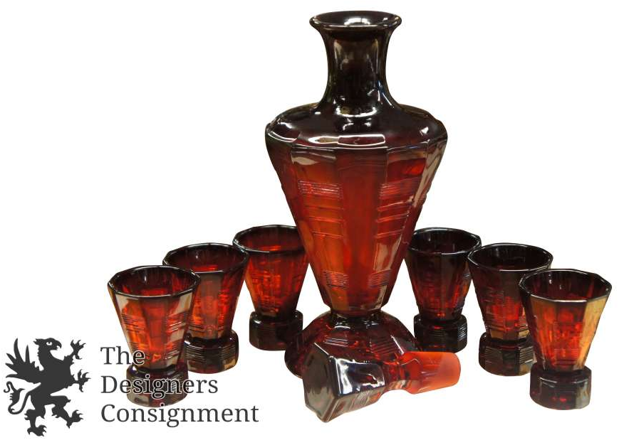 A rare glass set from Fenton that was featuredin Fenton Glass: The Second Twenty Five Years by William Heacock on page 139. Titled "Franklin",featuresa sleek mid century modern decanter with stopper and 6 shot glasses. A beautiful piece that will look great in any collection. This set came in 3 colors and is very hard to find.