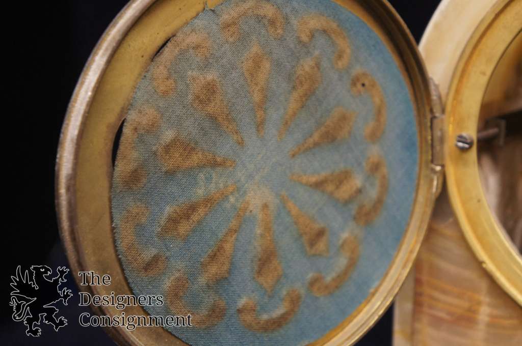 A stunning empire style clock by Spaulding & Co. Features a beautiful alabaster domed case with bronzed accents. Gold face with filigree center and beveled glass cover. Perfect for any mantel.