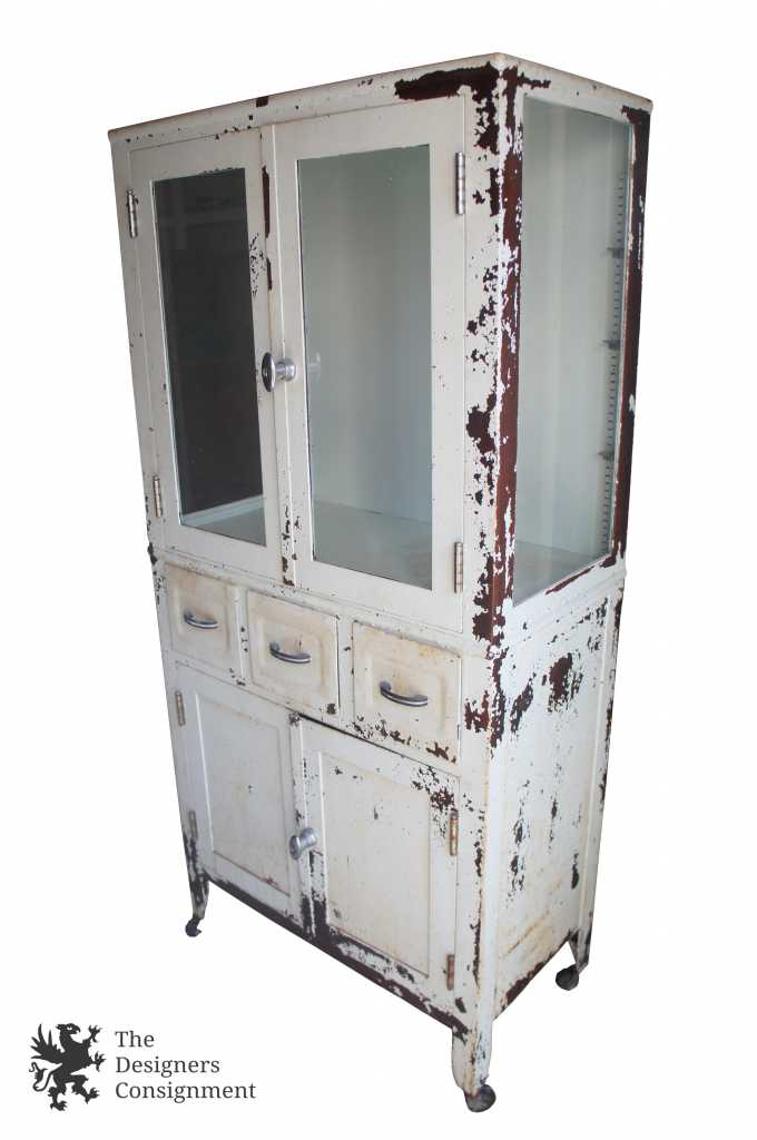 A unique early 20th century medical cabinet. Features a glass front over 3 drawers and a lower cabinet for storage. The cabinet was originally a brown color with a wood grain pattern. It could be stripped to return it to the original condition.