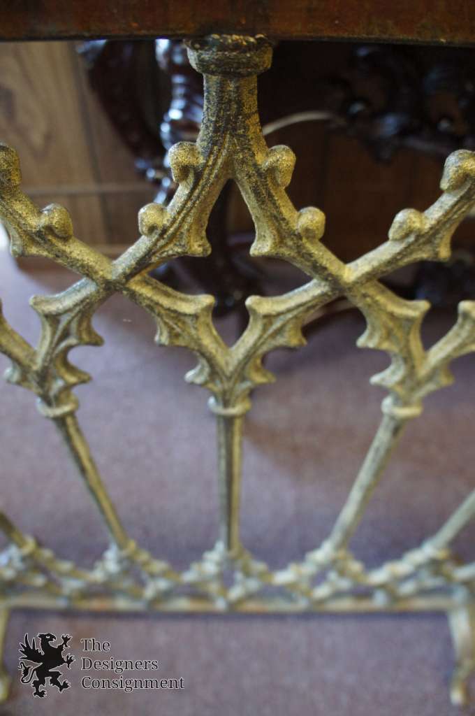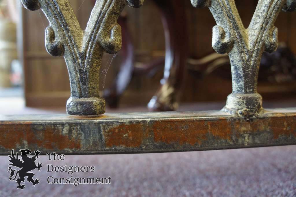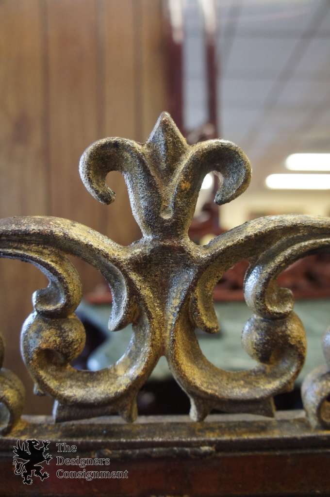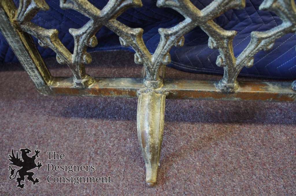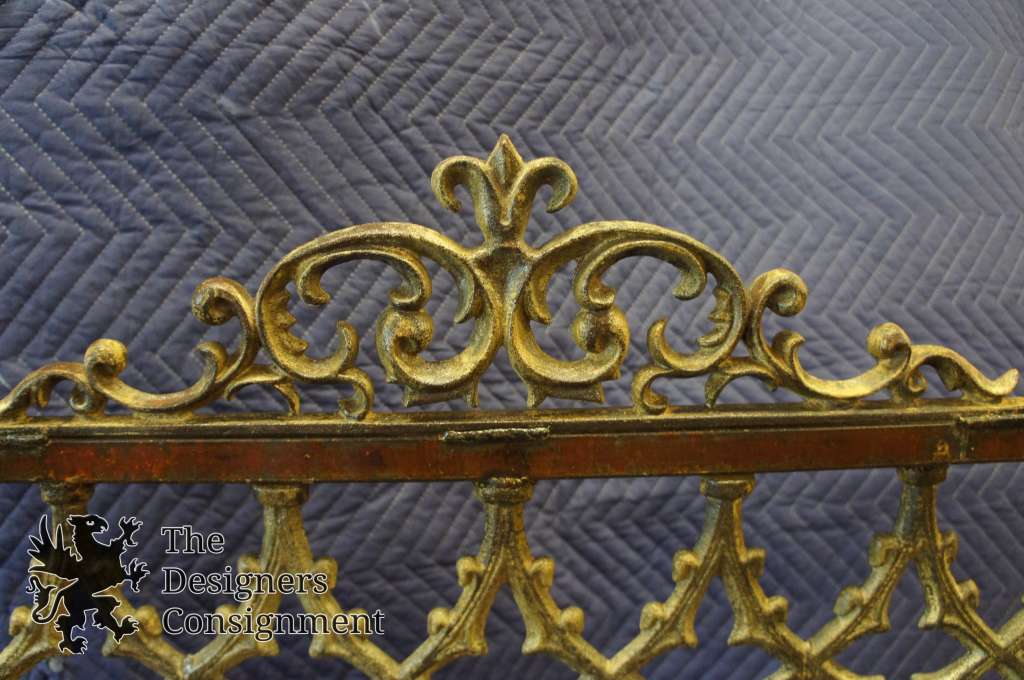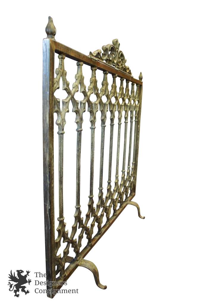 A beautifully designed handmade fireplace screen. Made from cast iron in the 90s with vivid detail. Rectangular with a medieval design and scrollwork. Nicely weighted and finished in an antique gold.