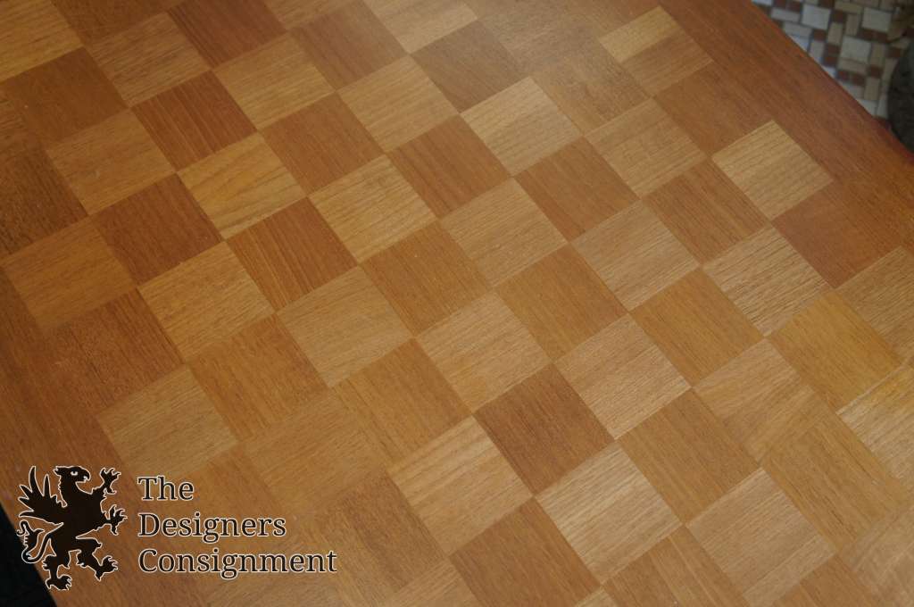 This vintage, mid-century modern cocktail table has a large rectangular top with a checkerboard inlay on square leg supports. France & Son was one of Denmark's greatest furniture makers and the company was eventually sold to Cadovius in 1964 and renamed CADO.
