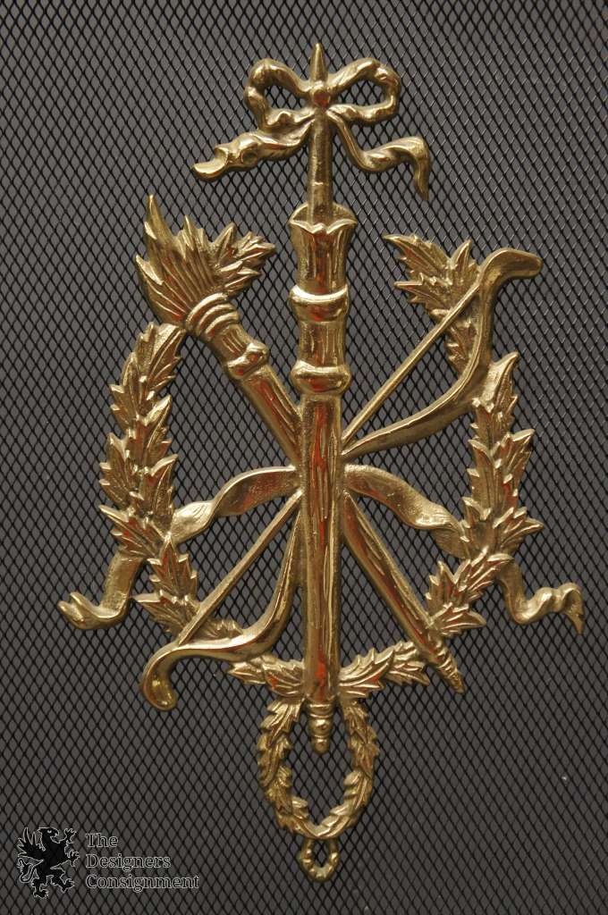 Louis XV Style Gilt Brass Fireplace Screen. Features a mesh insert allowing you to see the fire behind. At the center is a Torch and bow surrounded by laurel leaves. Frame is vibrant and ornate with French styling throughout. A fantastic addition to any setting.