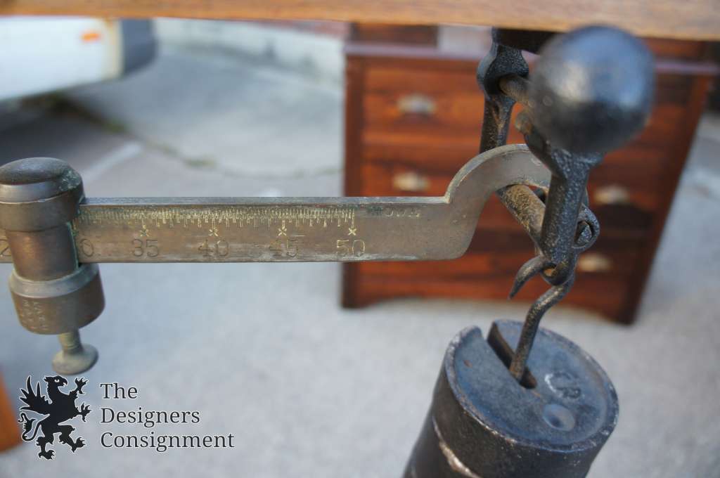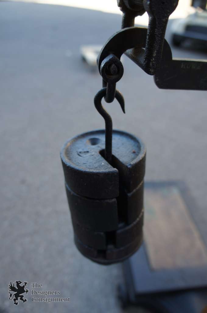 An antique cast iron and wood Howe industrial feed/grain scale. Howe scales were manufactured for one hundred five years and were invented and perfected by Frank M. Strong of Vermont. In 1856, Strong added ball bearings to Howe scales and this ingenious invention won him all of the prizes for scale technology in industrial arts at the Paris Exhibition. The company ceased operation in 1982. This feed or grain scale has a single arm under which are mounted a weigh beam with an iron weight attached which can be moved for calibration. At the end of the beam is a hook on which hangs a weight holder. The post that holds the beam holds the spring which carries the weigh beam. The platform is cast iron but the weighing platform is wood, suspended on the cast iron. Patented in 1867 & 1870. Serial Number 268547