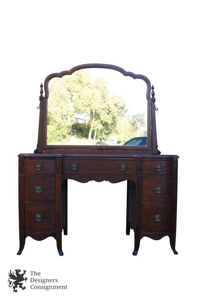 The perfect dressing table. Made from Mahogany with a serpentine front and 7 drawers. Features carved accents and a fluted frame. Mirror is scalloped with a beautiful grain.