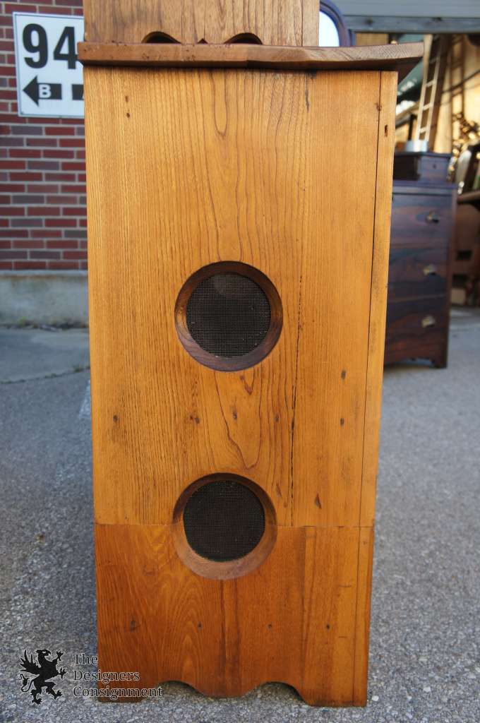 A neat pie safe for any setting. Made from Oak and Maple with hand cut nails and door knocker pulls. Lower portion features 2 drawers over a lower cabinet with ventilated sides. Top cabinet is a stepback with 2 interior shelves. Ornate cresting throughout.