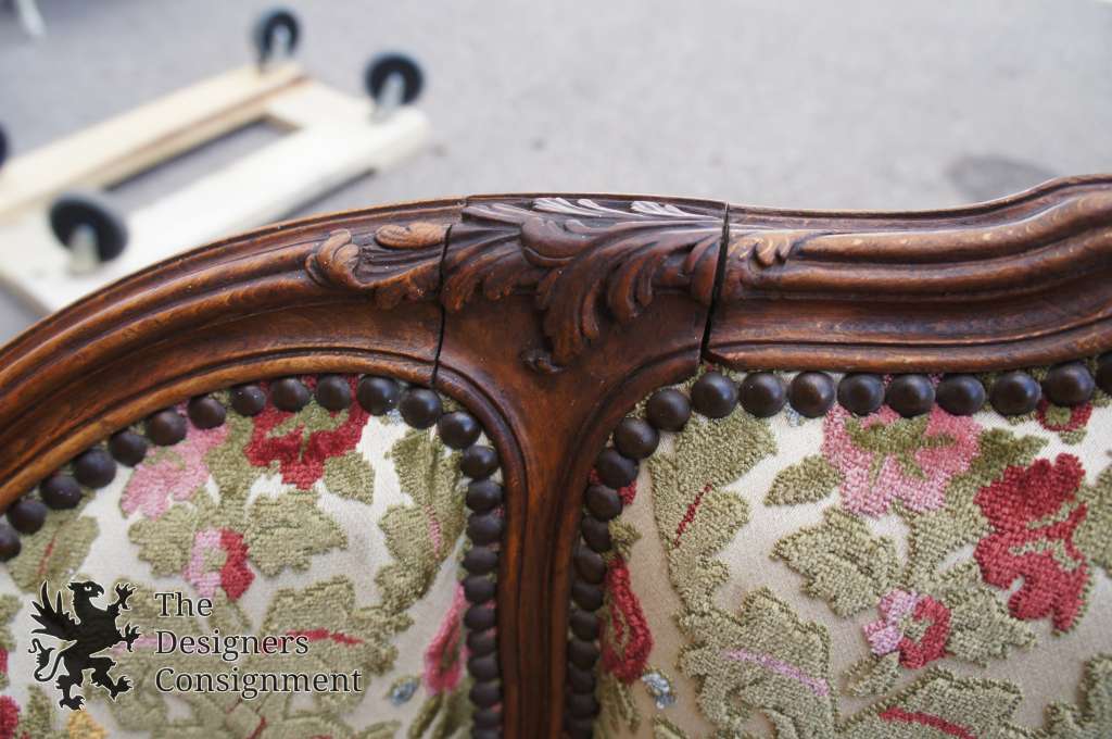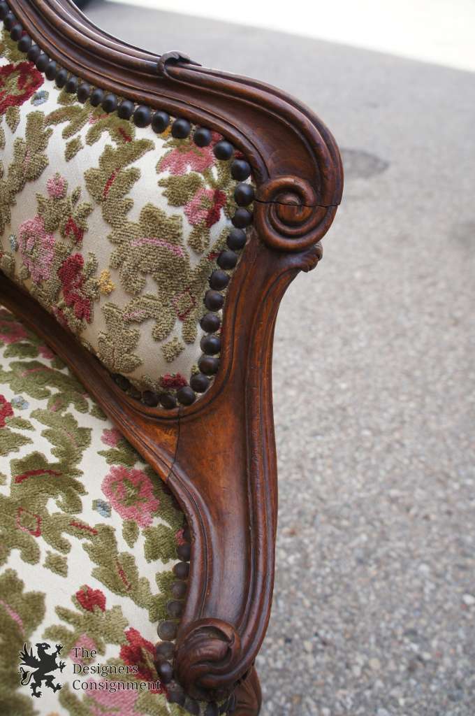 Gorgeous pair of antique Louis XVI style bergere chairs. The perfect addition to any parlor. The arms flare open making it very comfy to sit on. Upholstered in a raised fabric. Made from walnut with intricately carved detail.