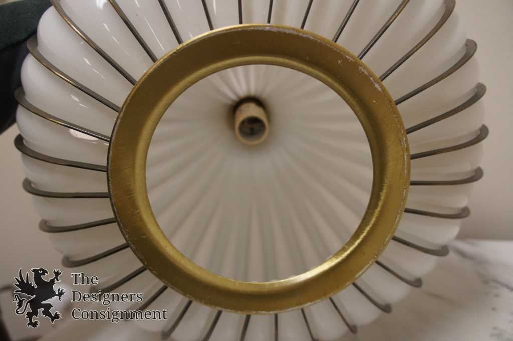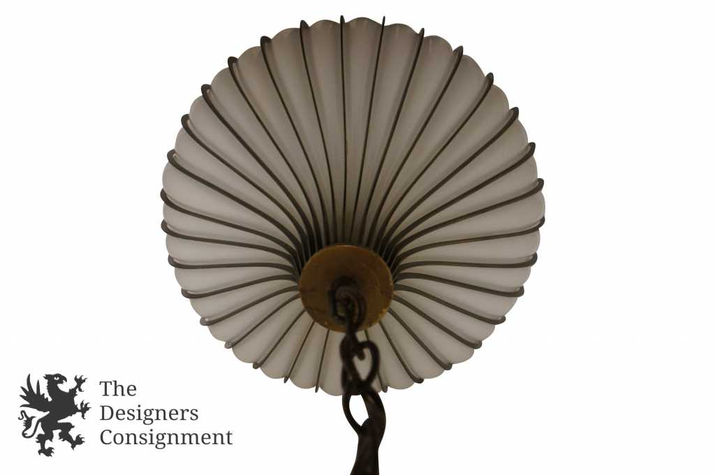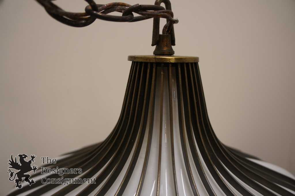Rare and beautiful hand-blown glass and metal onion form pendant light. opal white hand blown glass within a ribbed brass frame shaped like an onion. Circa 1970's