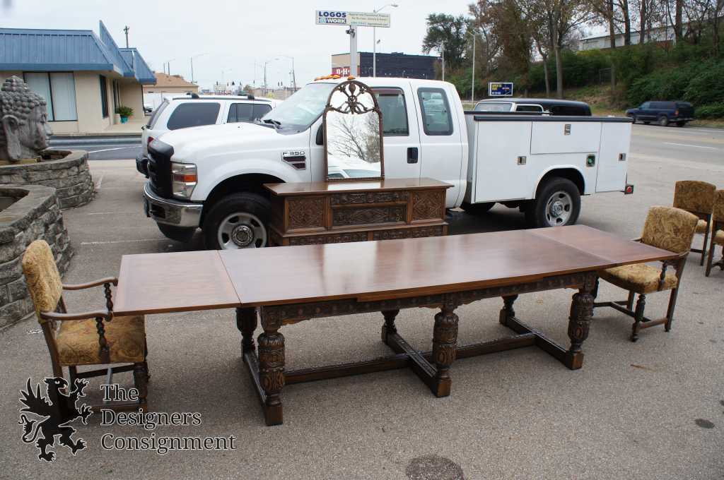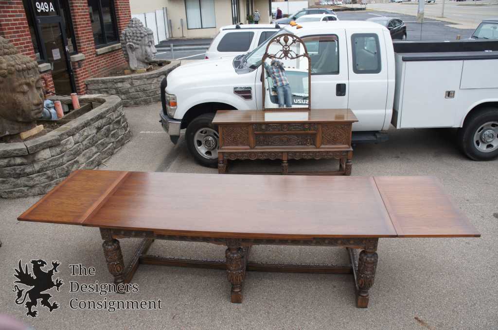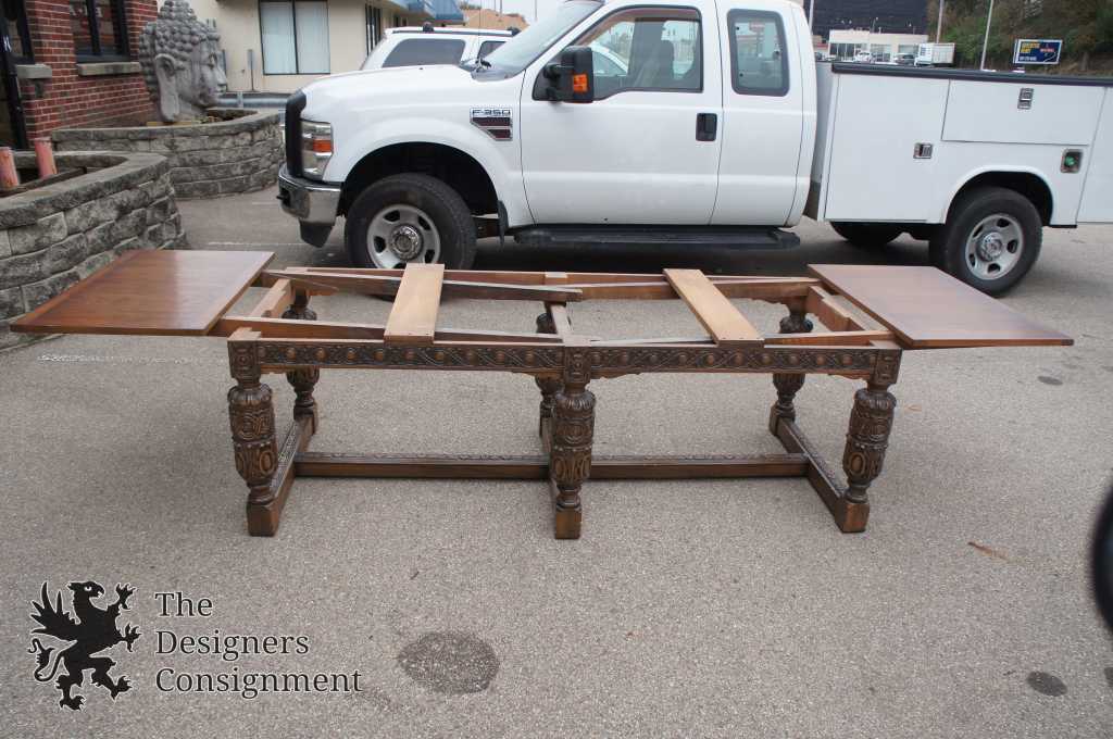 A gorgeous dining room table with extension up to 12 feet. This table features a high relief carved robust base with trestle. Top is Oak withleafsthat store beneath. The perfect blend of Spanish Revival and Arts + Crafts. A magnificent addition to any setting.