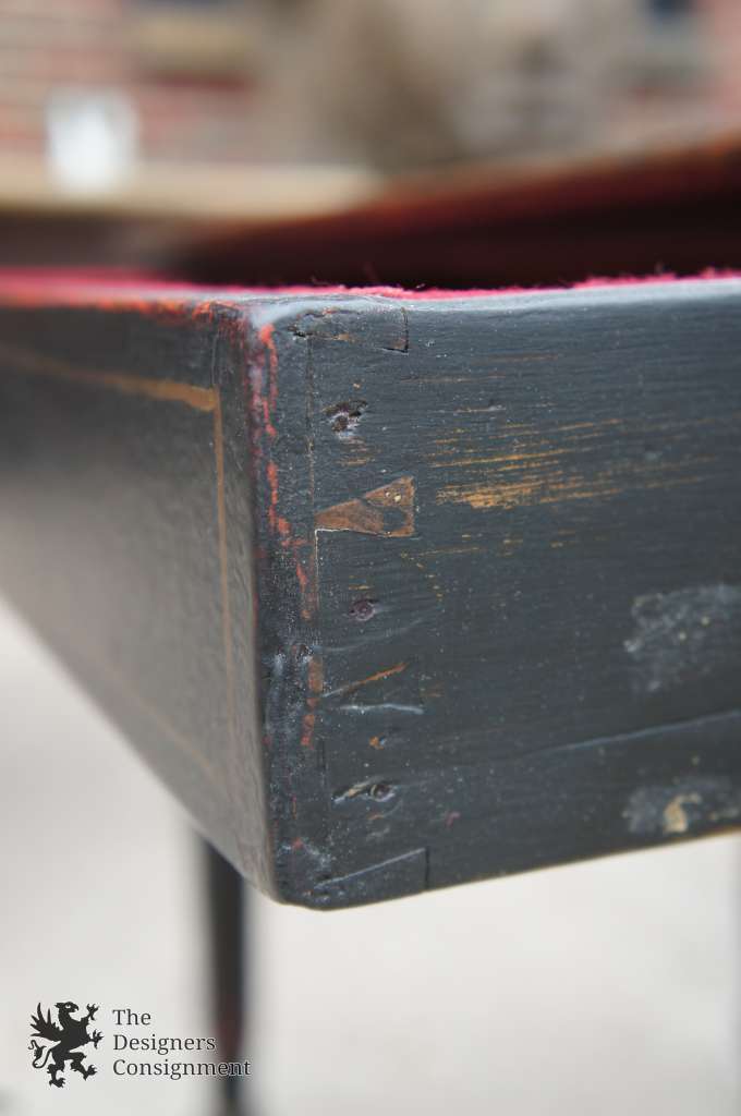 Beautifully hand painted writing desk. Black painted over red with gold trim and brass hardware. The drawer is felt lined, hand planed and dovetailed. Legs are tapered, and top is distressed. The perfect accent to any setting.