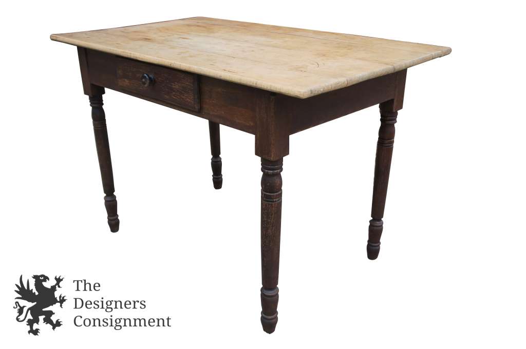 Painted and distressed writing desk. Legs are made from pine and turned. Removable for ease of moving.
