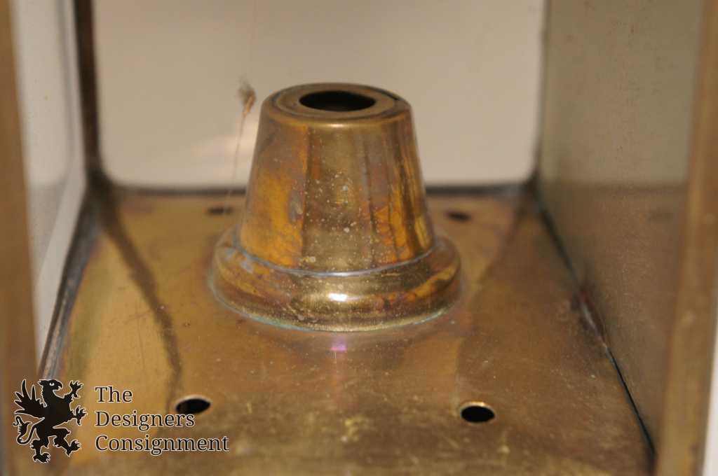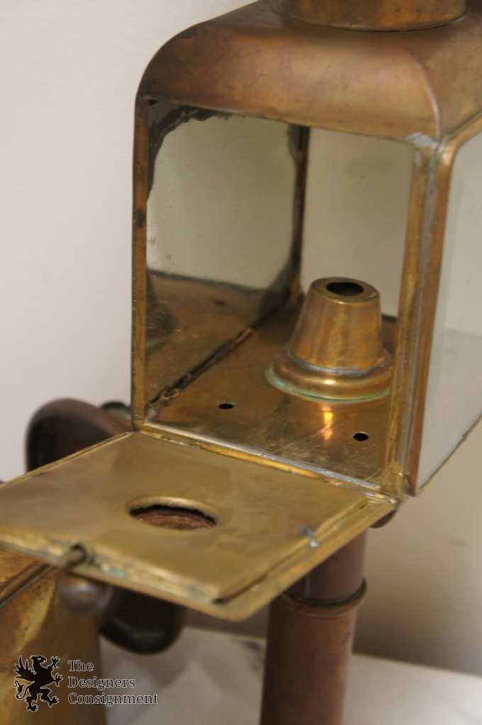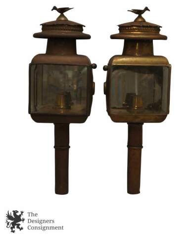 An amazing pair of antique oil lanterns. Made from brass with beveled glass and a mirrored back. Each features a bird finial. It is common to see an eagle finial on these types of lanterns, but very rare that you find a traditional bird. A great addition to any collection.