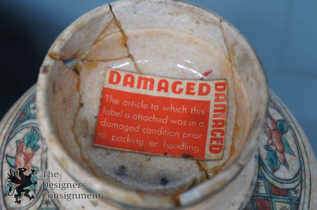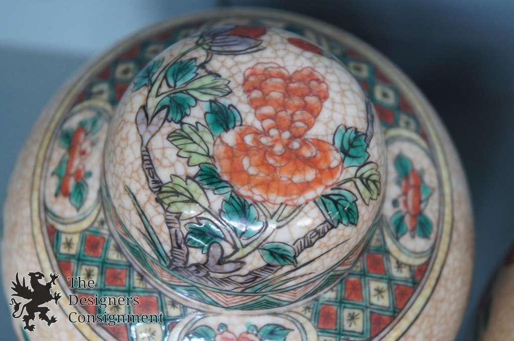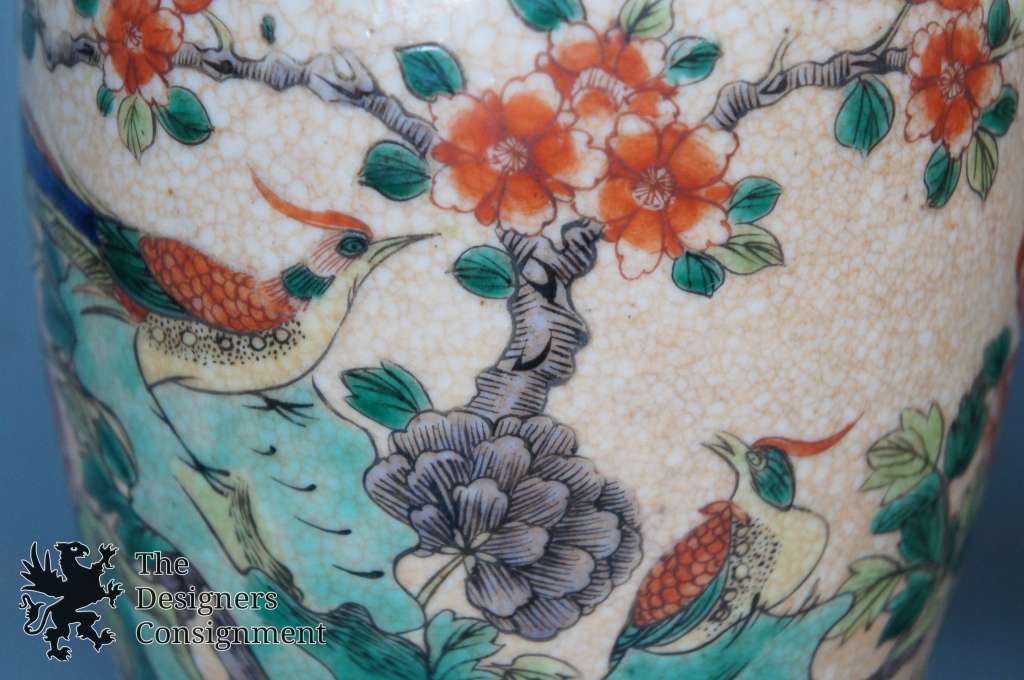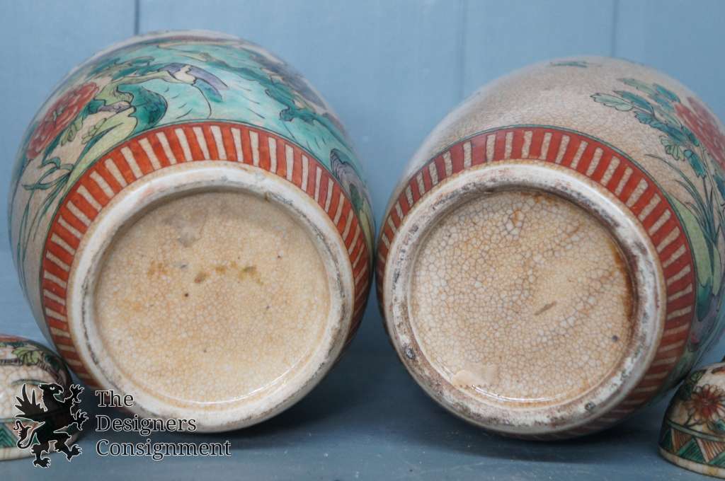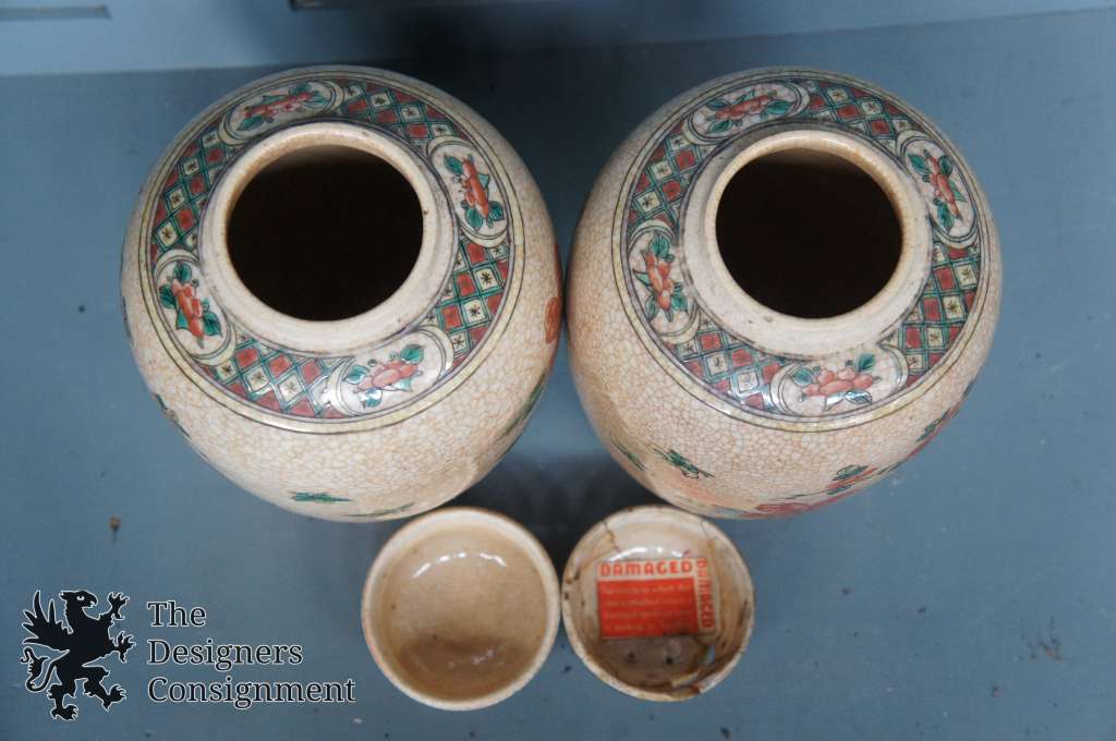 A beautiful pair ofChineseginger jars that were purchases towards the middle of the century. One of the lids was damaged in the factory prior to shipping and bears the original sticker showing this. An unusual yet unique notification. Each vase has a cherry blossom tree pattern with bird by a body of water.
