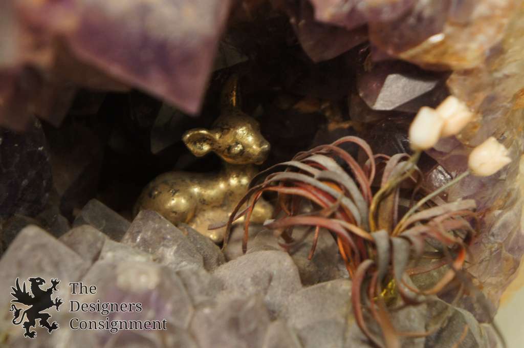 A magnificent sculpture. Depicts a willow tree in brass with copper birds over an amethyst geode with brass figures by the base of the tree. This piece is unsigned, however most likely made by Curtis Jere. Meticulously detailed in brutalist styling. This piece is currently for sale as a local pickup item, however we could have thepiecehand delivered for additional fee.
