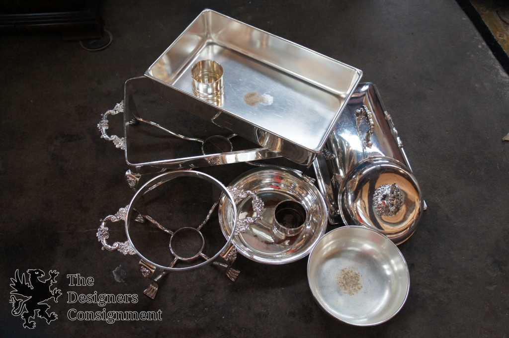 A handmade silver-plate set commissioned for Benham's caterers in Dayton, Ohio with crates for protection and storage. Each piece is footed and handled with figural details and repousse. Includes a very large coffee/water pot, Medium sized kettle and 2 large warming dishes. A magnificent addition to any collection.