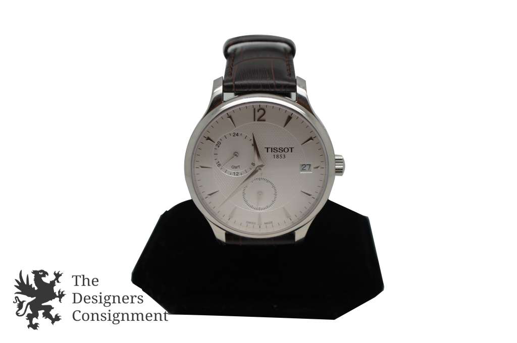 Stainless steel case with a brown leather strap. Fixed stainless steel bezel. White dial with silver-tone hands and index hour markers. An Arabic numeral marks the 12 o'clock position. Minute markers around the outer rim. Dial Type: Analog. Date display at the 3 o'clock position. Two sub-dials displaying: 60 second and 24 hour (GMT). ETA caliber G10.961 quartz movement. Scratch resistant sapphire crystal. Pull / push crown. Solid case back. Case size: 42 mm. Case thickness: 11.07 mm. Round case shape. Band width: 20 mm. Band length: 7.75 inches. Butterfly clasp. Water resistant at 30 meters / 100 feet. Functions: chronograph, rattrapante, GMT, second time zone, date, hour, minute, small second. Dress watch style. Watch label: Swiss Made. Tissot Tradition GMT White Dial Mens Watch T0636391603700.