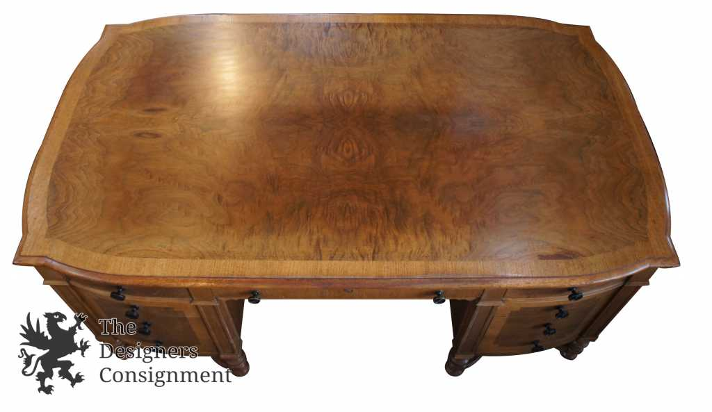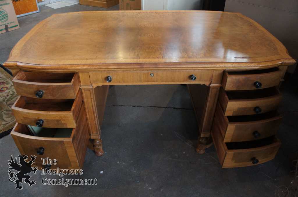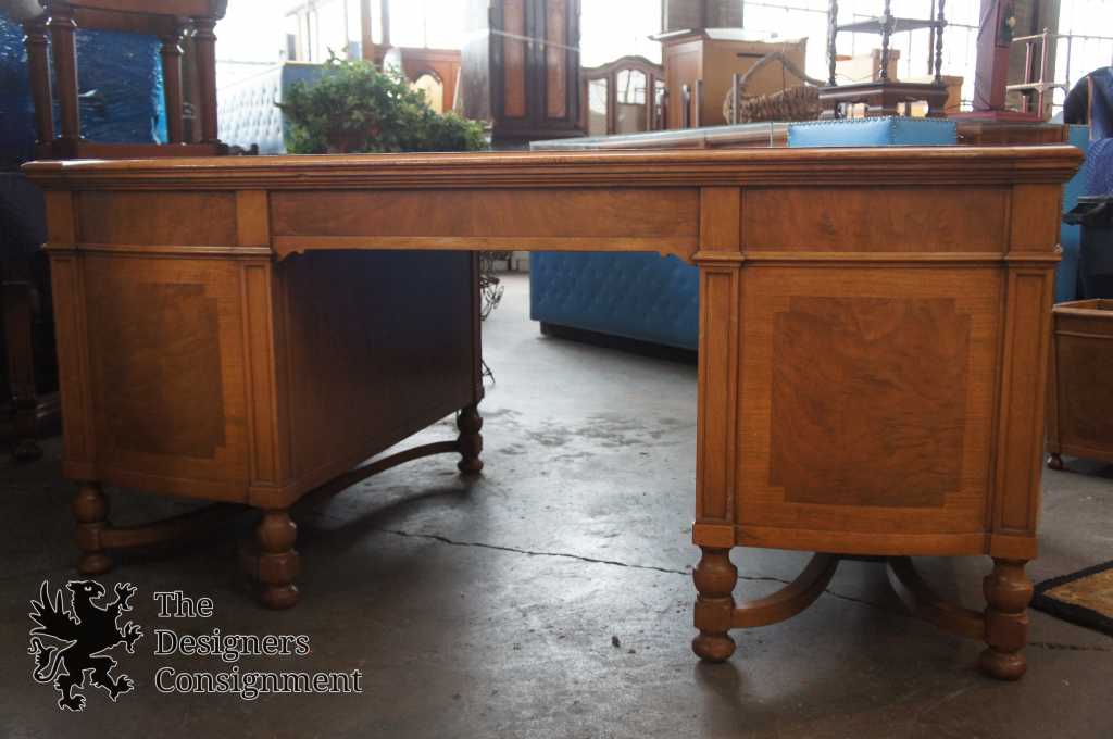The piece at hand is made from walnut with a beautiful two tone match-book veneer top. Each side has 4 turned legs that lead to bun feet. The legs are connected front to back through a doubletrestle. Features 8 dovetailed drawers pressed with the Doten-Dunton insignia at the base. Along the lower left is a file drawer. The waste basket is matching with the Doten-Dunton insignia along the bottom. A fantastic pairing that will look great in any office space.