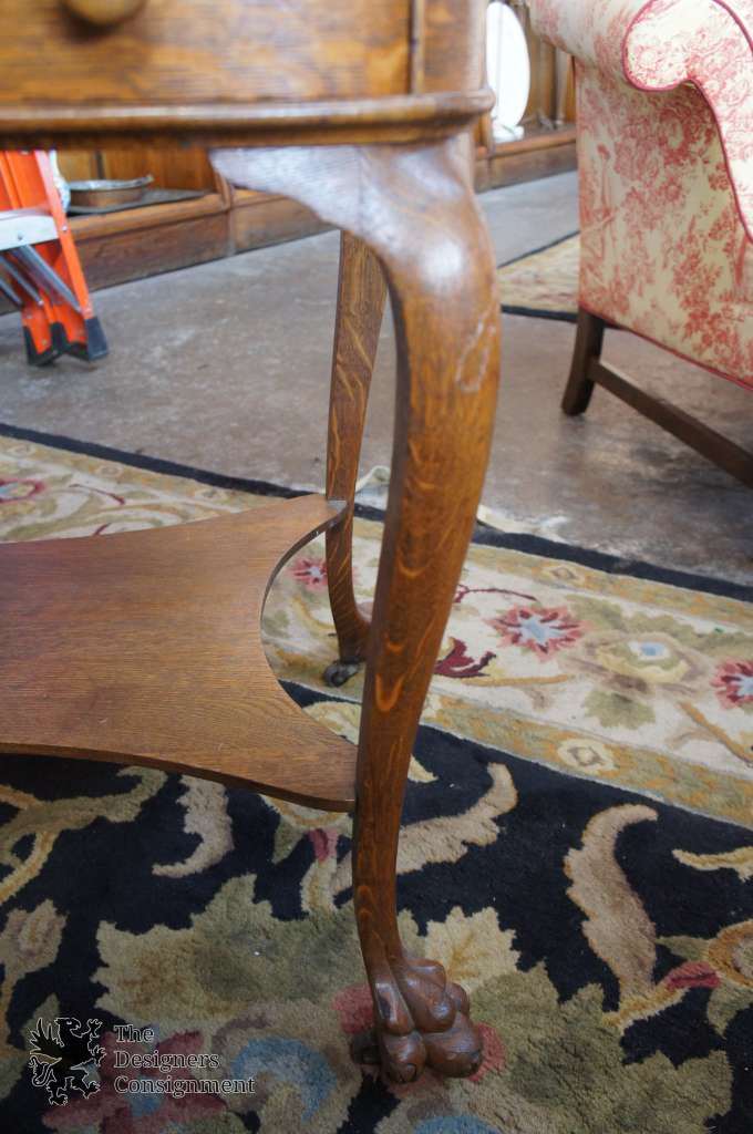 A beautiful late 19th/Early 20th century office desk. Made from Quartersawn Oak. Features a unique shape with rounded edges and a glass top. Cabriole legs lead to beautifully carved paw feet. The feet have casters for ease of moving. Comes with custom fit glass top. A great addition to any setting.