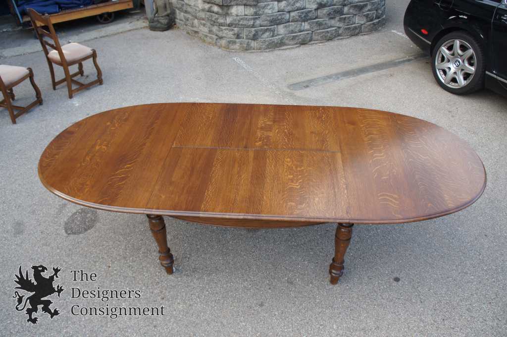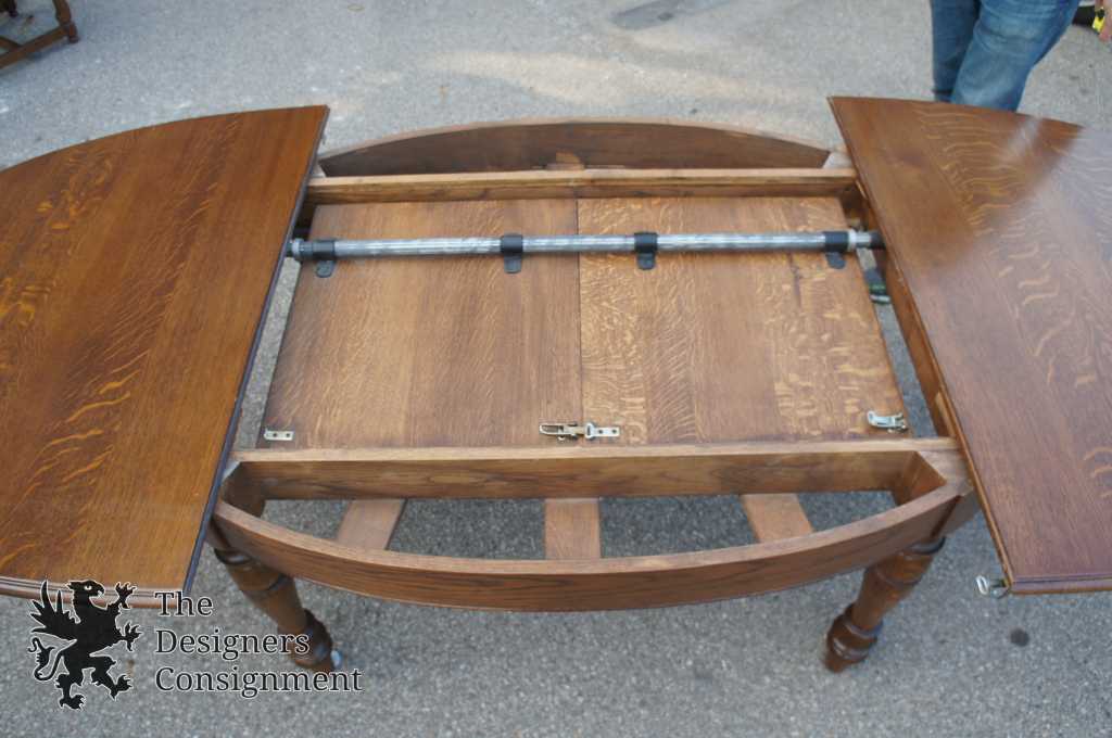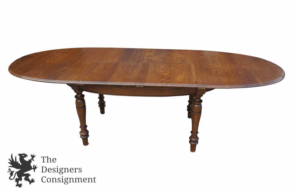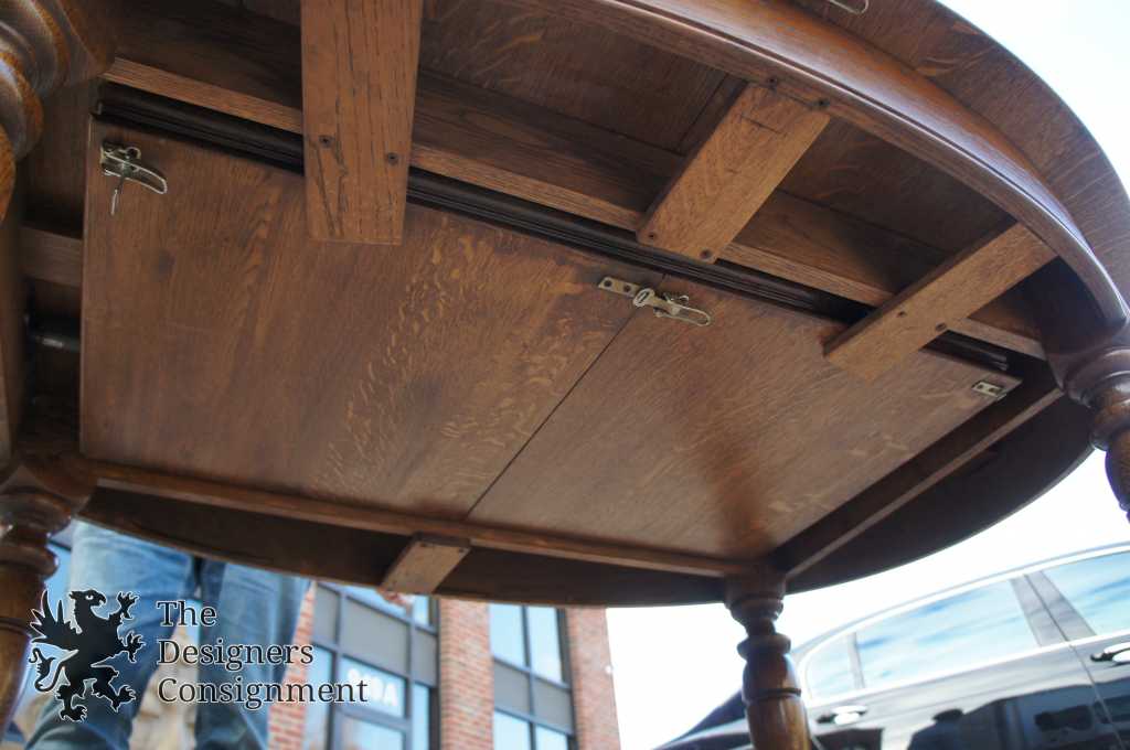 Belgium Made Oak Dining Table. Features an Ovular shape with extending top. Additional leaf is stored within the table and hinges out into place through a unique mechanism. Table legs are turned with elegant detail.