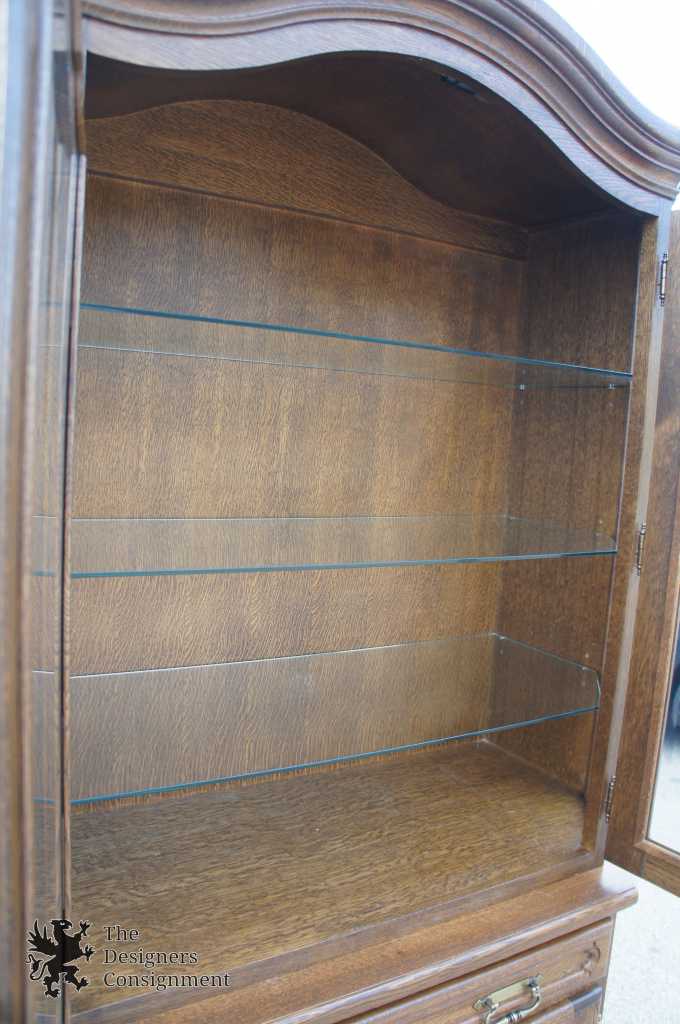 A beautifully crafted oak China Cabinet. Made in Belgium before being brought over to the states. Traditional/ English styling. Circa 1980s. Features a serpentine front with beveled glass, locking doors, illuminated interior and 3 glass shelves. Lower cabinet portion has a main drawer for silverware over double doors with a wooden shelf. Clean lines and smooth trim. A great addition to any space.