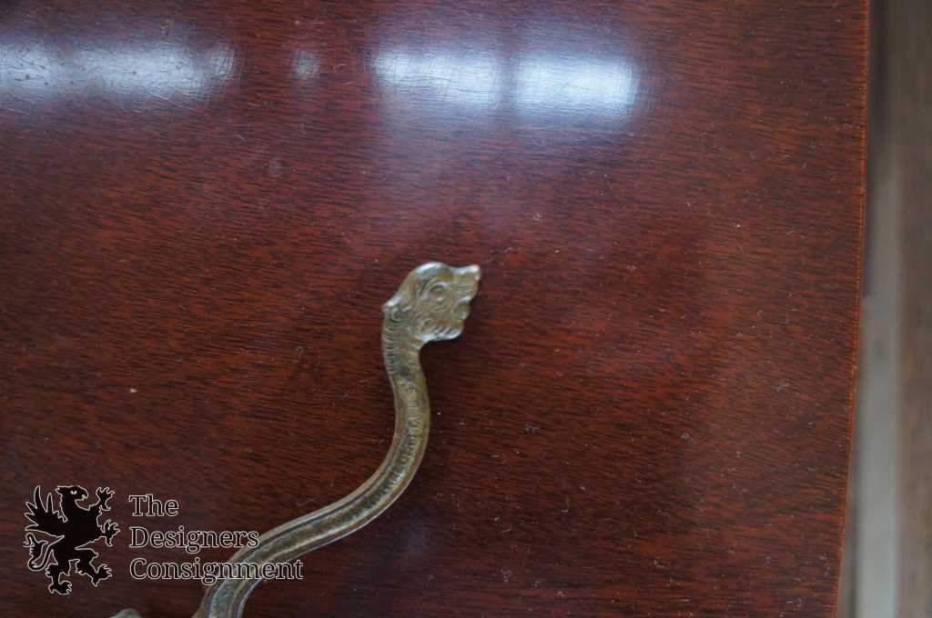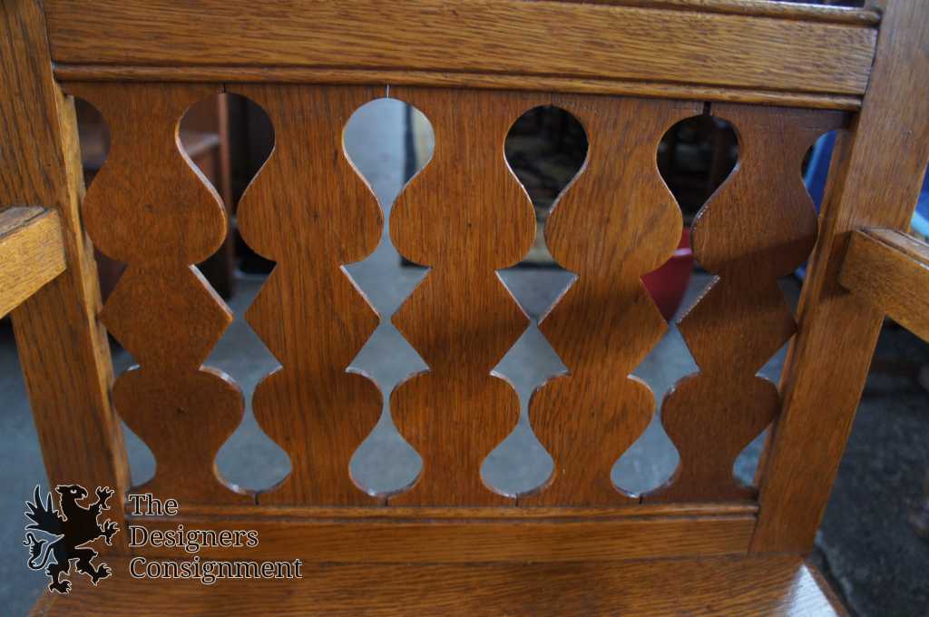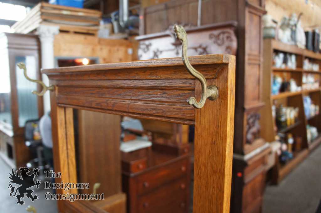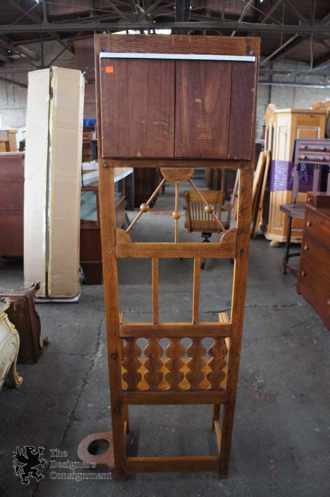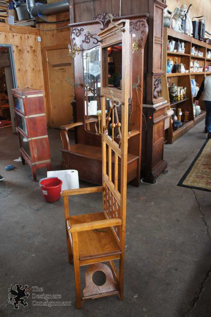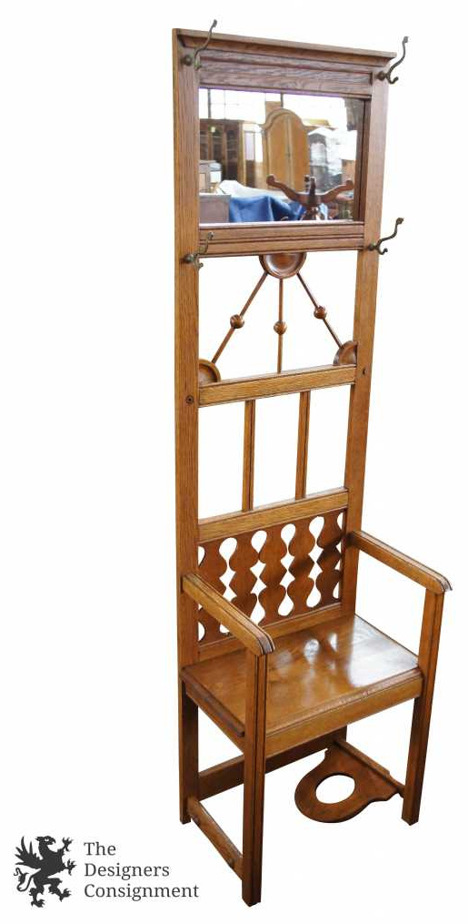 A beautifully designed early 20th century hall tree. Unlike most this piece has a narrow profile. Arts & Crafts style with 2 different designs carved into the back. Features a lower catch for umbrellas and canes that flips in and out when needed. Hardware is brass with what appears to be the face of some type of cat. Overall a gorgeous piece that will look great in any space.