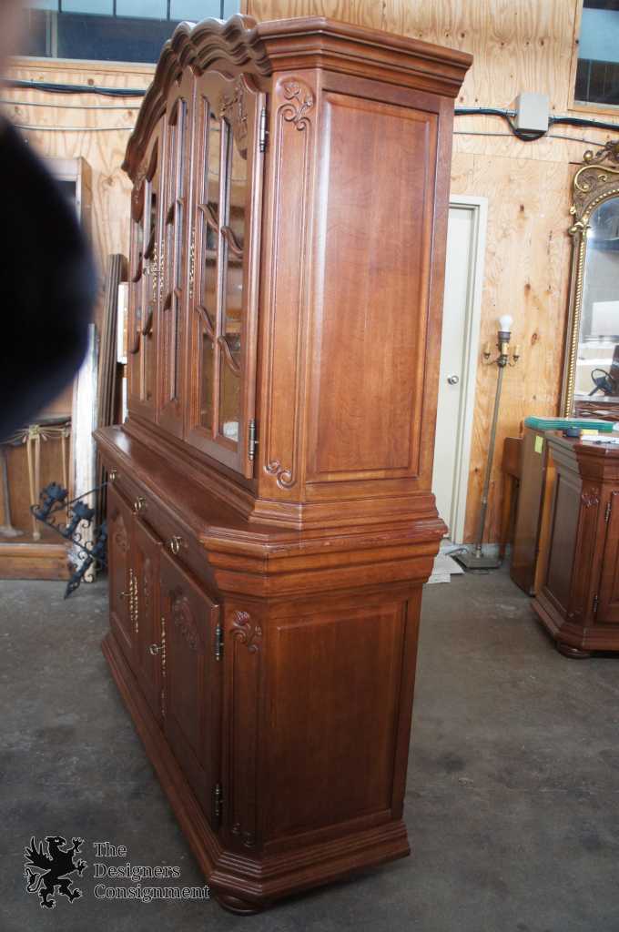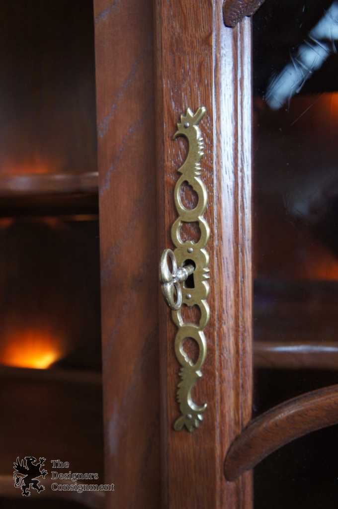 A beautifully crafted Oak China Cabinet. Made in Belgium before being brought over to the states. French Country/ English styling. Circa 1980s. Features a serpentine top with antiqued glass doors, illuminated shelves and locking doors. Lower cabinet portion has 3 drawers over 3 cabinet doors with shelves. Clean lines and smooth trim. A great addition to any space.