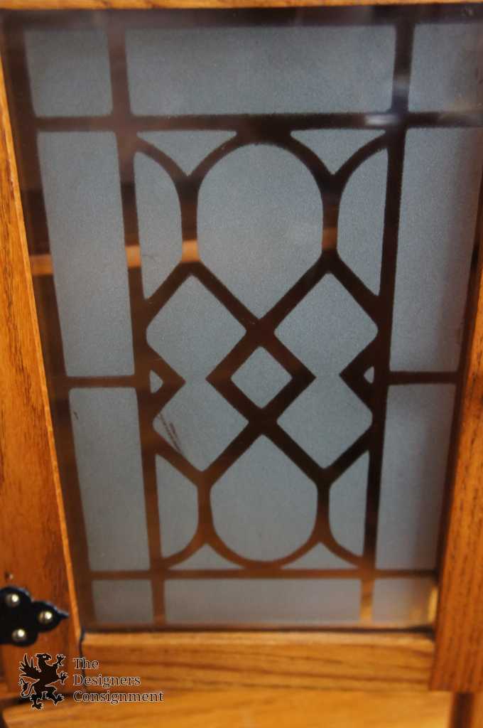 An amazing Hoosier style cabinet by the Wilson Cabinet Company of Greencastle, Indiana. This piece features a step-back cupboard with etched glass doors, 4 drawers and a shelf for spice or storage. The base features a large work surface over several compartments. There are 2 flour bins and 2 traditional drawers. Along the left is a full cabinet door with interior spice rack and a roll-out drawer. Just below the work surface is a pullout board for chopping. The piece is on casters for ease of movement. Overall an inspiring work of craftsmanship and attention to detail.