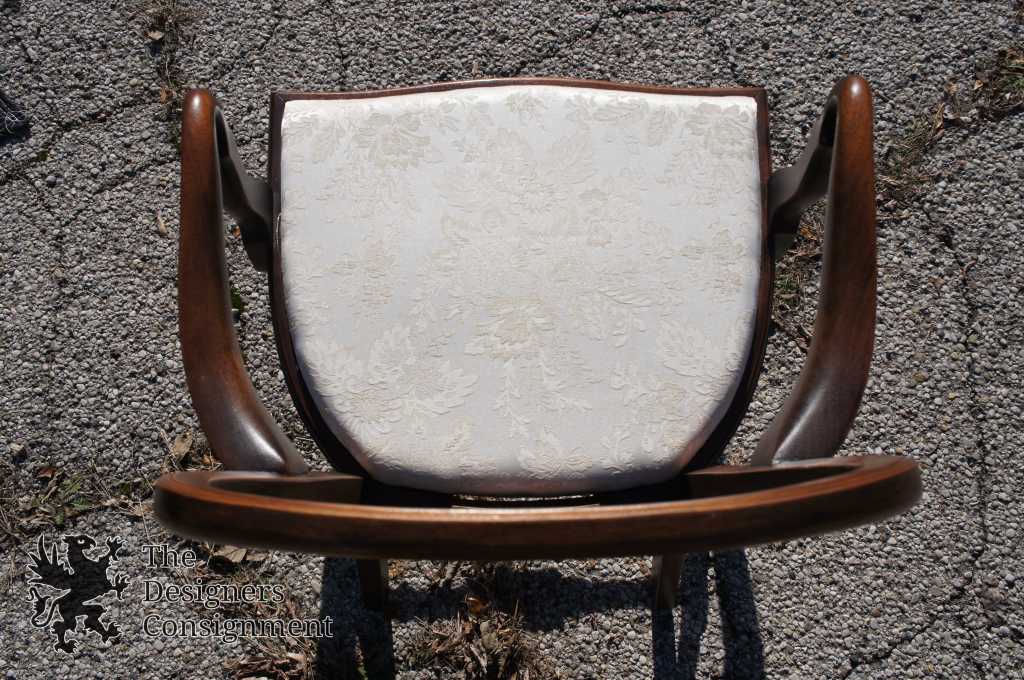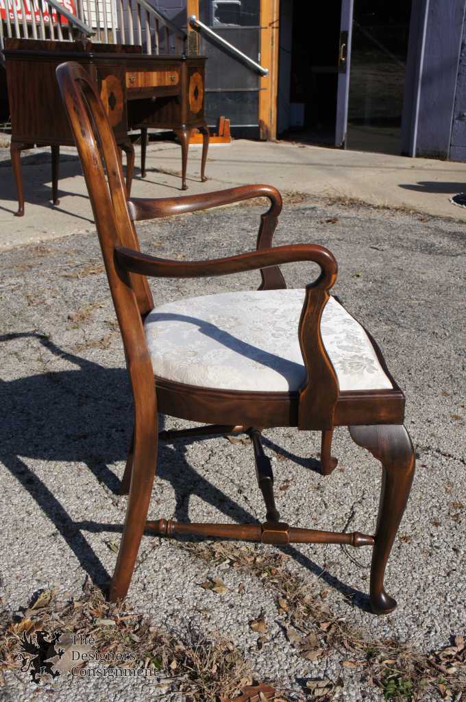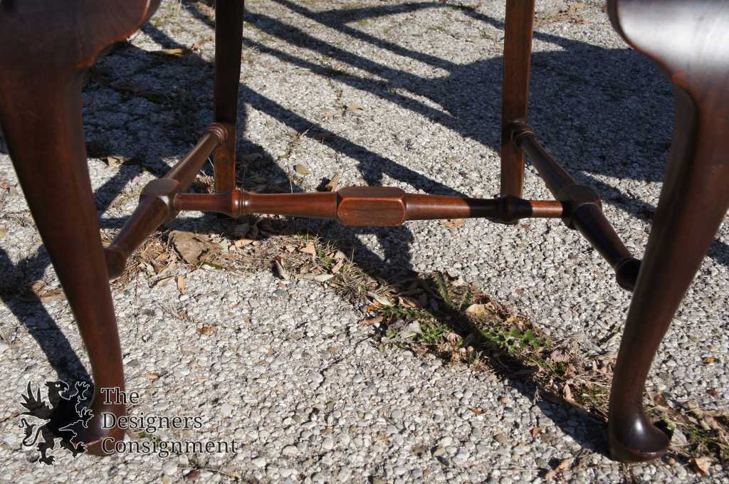 A gorgeous 1940s Dining Room Set. Queen Anne style with swooping cabriole legs. Made from Mahogany. The table has flamed corners showing marquetry inlay clover leaves. Features 4 table leaves for extension and removable legs. There are 6 chairs with turned stretchers and floral upholstered seat. Additional matching pieces available.