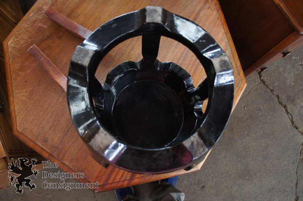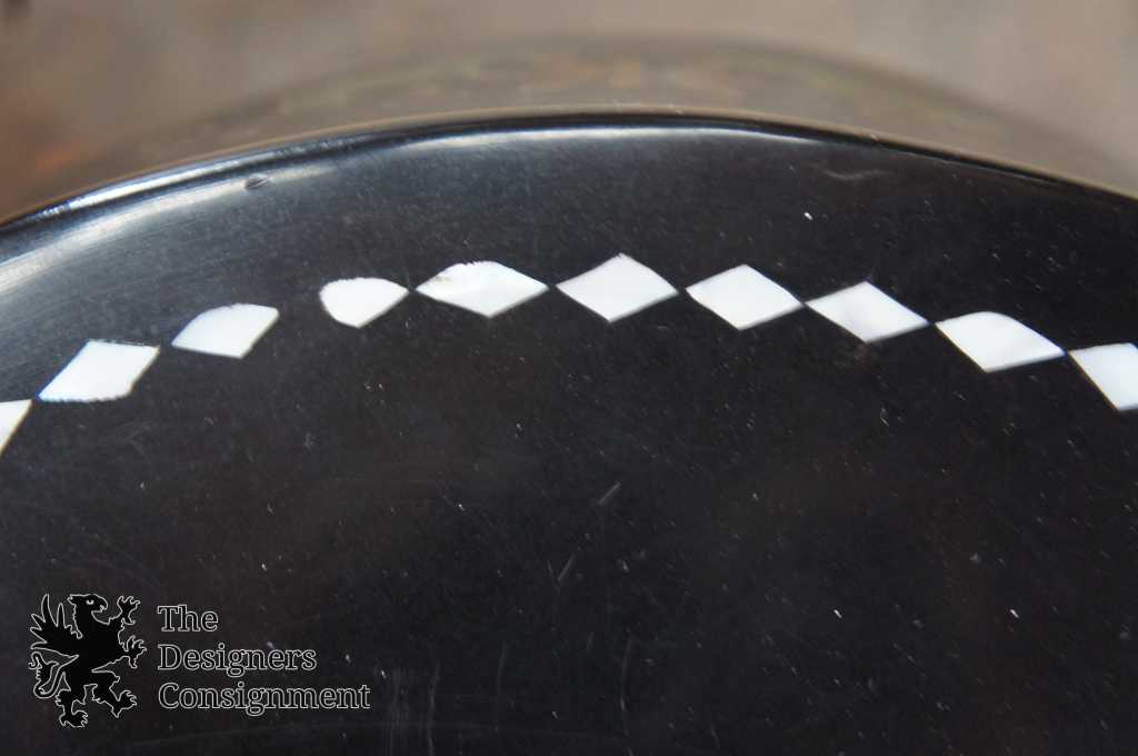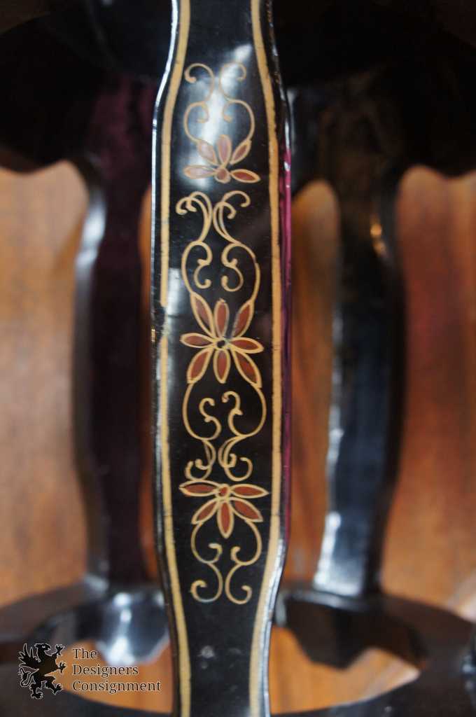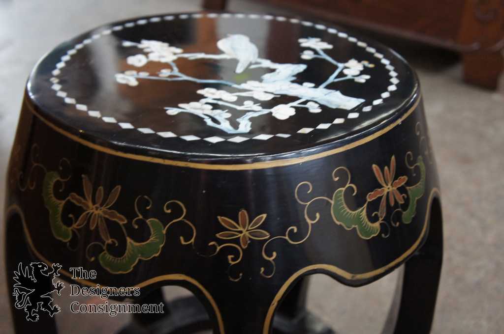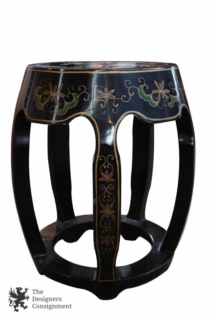 A beautiful black lacquer Chinese stool or stand. Hand painted with green and red floral detail, framed in gold outlining. The top of the stool is inlaid with a bird perched on a cherry blossom tree. A gorgeous piece that will make a great addition to any collection.