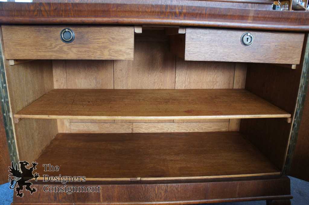Intriguing Art Deco Server with glass front hutch for display. Made from Oak with parquetry design and carved accents. The lower portion opens to reveal two drawers and a shelf. Each drawer is dovetailed, and accented with neoclassical hardware. The right drawer is lockable. Hutch features split beveled glass doors and shelf for display. A beautiful overall design that will make a great addition to any collection.