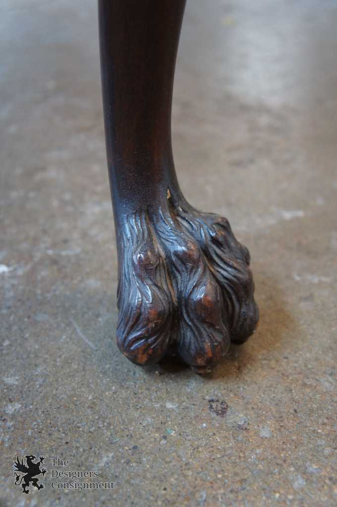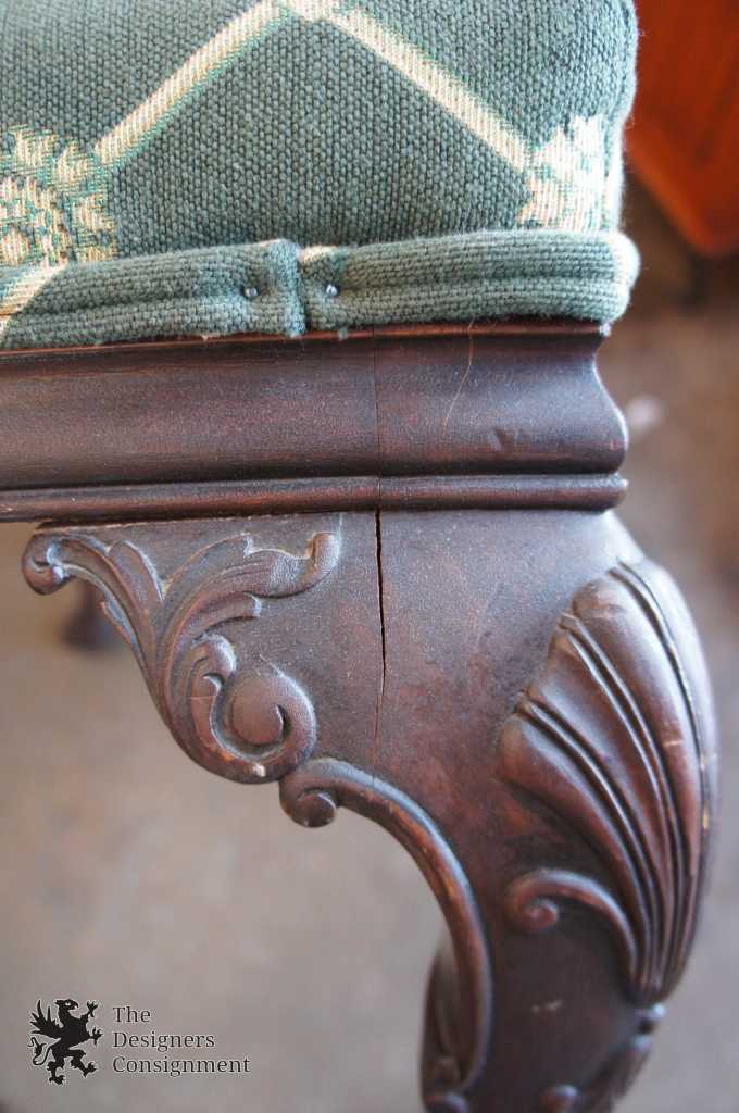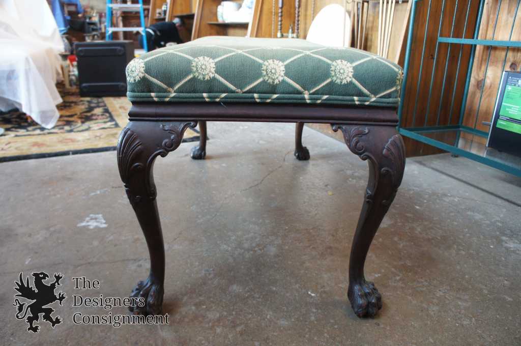 A gorgeous early 20th century Chippendale style bench. Made from Mahogany with exquisite detail. A rectangular shape with scalloped cabriole legs leading to carved lion paw feet. Upholstery is green with a lattice pattern capped with medallions. A fantastic addition to any setting.